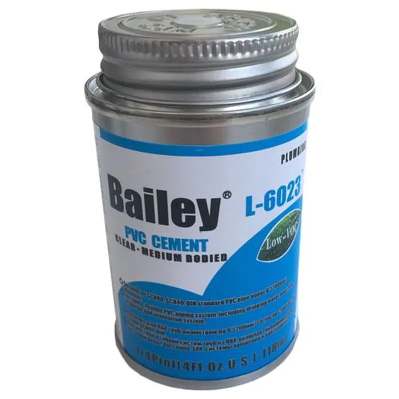 Клей для труб ПВХ Bailey L-6023 підходить для склеювання ПВХ, ПВХ-M, ПВХ-O труб у системах з питною водою, басейнів, систем зрошення, каналізації та вентиляції. Однаково ефективний для гнучких та жорстких систем трубопроводів. Він спеціально розроблений для ПВХ трубопроводів в області басейнів та спа.