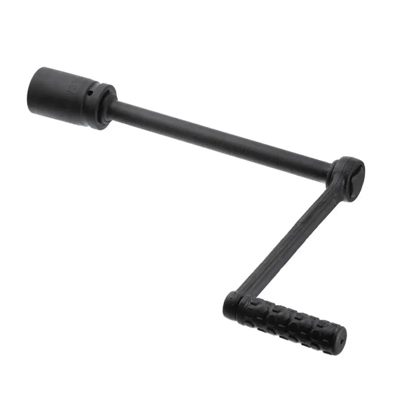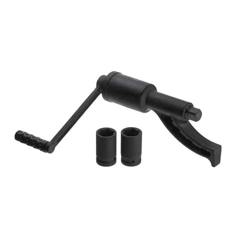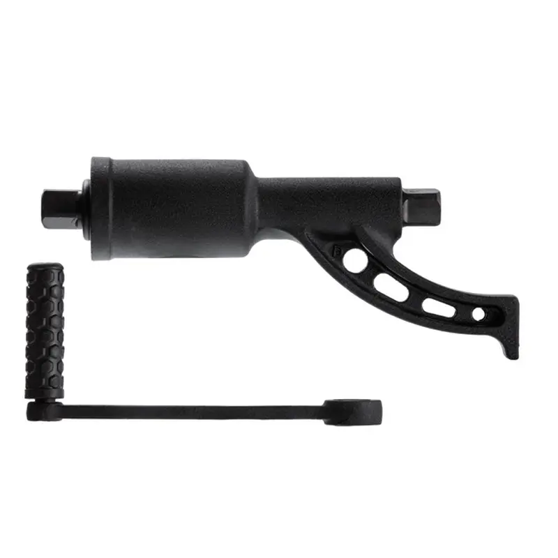 Перед початком роботи необхідно встановити ручку та обрати торцеву головку відповідного розміру. Для більш комфортної та ефективної роботи з ключем передбачена спеціальна ніжка, яка упирається в диск, забезпечуючи стабільне положення. Ручка має текстуроване покриття зі спіненого каучуку для кращої фіксації в руці.