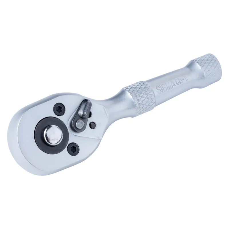 Ключ-тріскачка укорочена з металевою ручкою 1/4" 90мм 45T CrV SIGMA (6050211) - це необхідний інструмент при виконанні робіт з різьбовими з'єднаннями, який повинен бути в арсеналі кожного автослюсаря і майстри. Даний інструмент дозволяє виконувати монтаж / демонтаж різьбових з'єднань за допомогою біт з адаптерами або за допомогою торцевих головок.