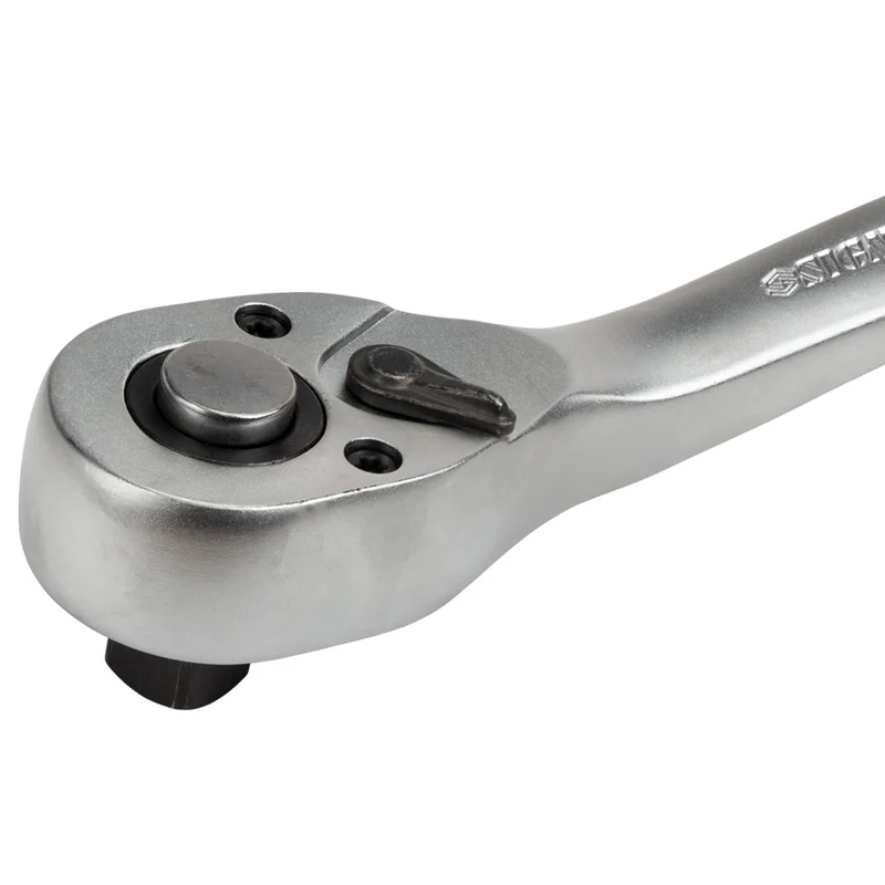 Ключ-тріскачка з вигнутою ручкою 1/2" 250мм 72T CrV SIGMA (6050091) призначений для монтажу і демонтажу різьбових з'єднань. Застосовується для слюсарних робіт, а також як інструмент на автосервісі при ремонті вузлів автомобілів. Пристрій трещотного ключа досить просте: вигнута рукоятка і головка, в якій розміщений храповий механізм.