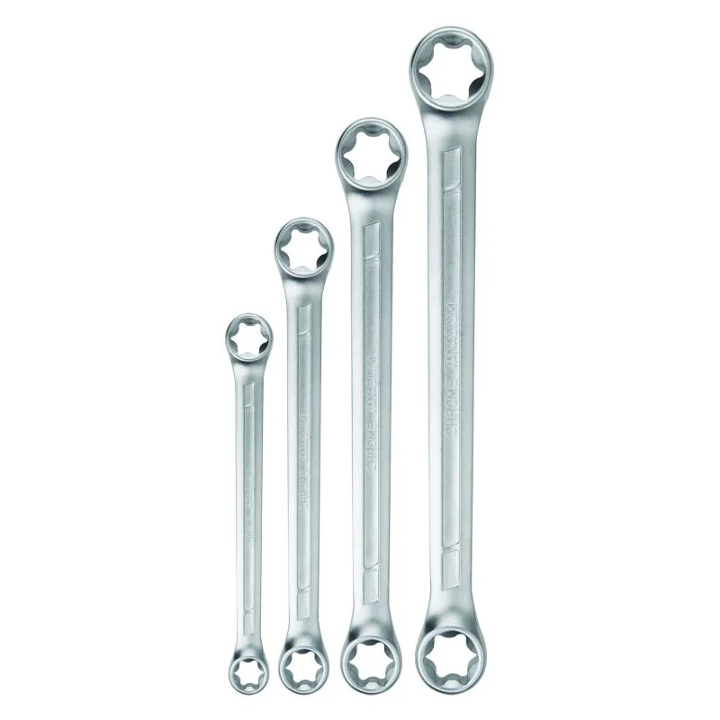 Ключі накидні Star Е6-Е24 4шт CrV ULTRA (6010012) – це професійний набір інструментів, який складається з 4 накидних ключів із внутрішнім профілем TORX. Набір призначений для монтажу/демонтажу різьбових з’єднань з відповідним типом профілю. Ключ складається зі стрижня з двома накидними головками, які мають зіркоподібний профіль TORX. Завдяки такому профілю ключ контактує з кріпленням по всій поверхні, завдяки чому забезпечує хороший захват та зменшує зусилля при відкручуванні.