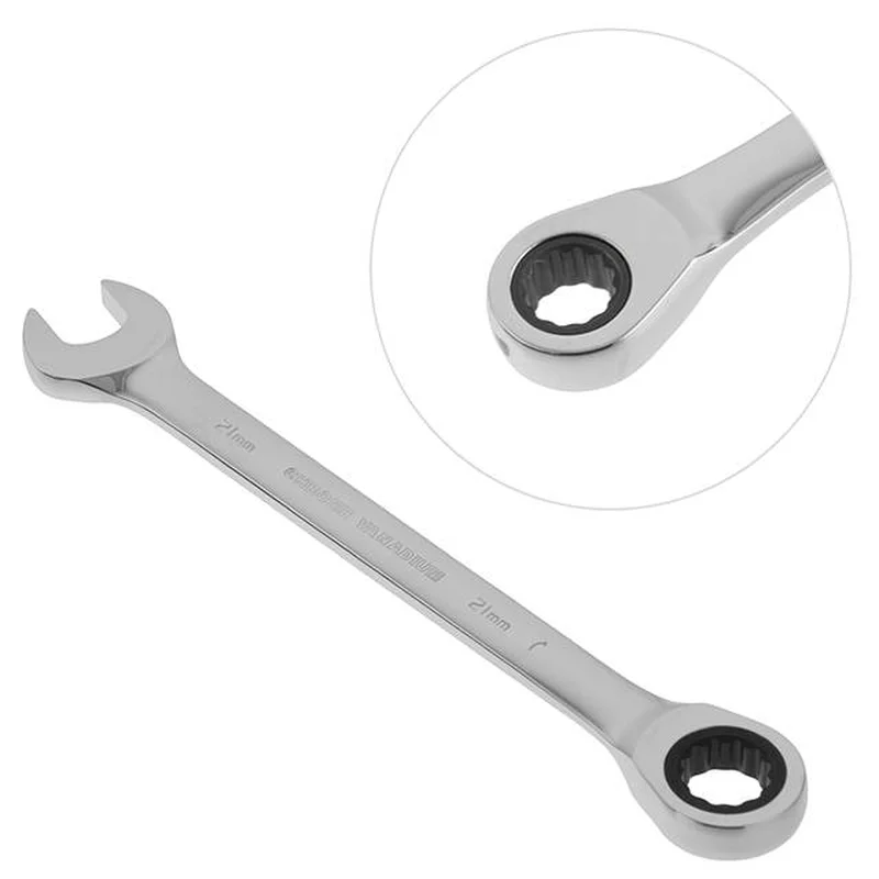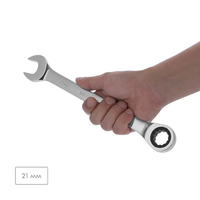 Комбінований ключ з тріскачкою розміром 21 мм призначений для монтажу та демонтажу різьбових з'єднань гайок та болтів.