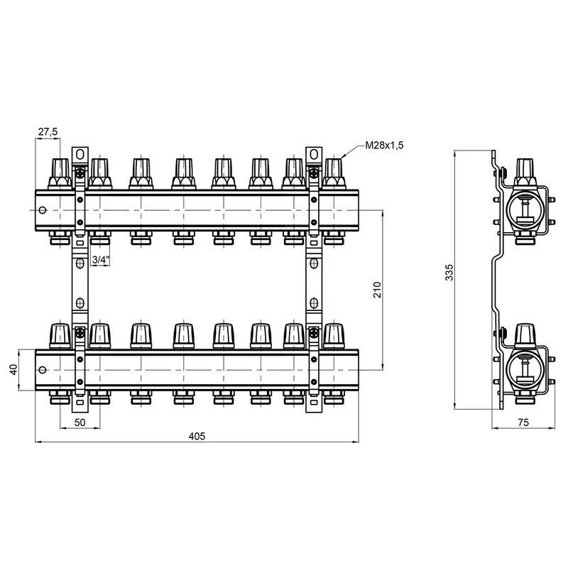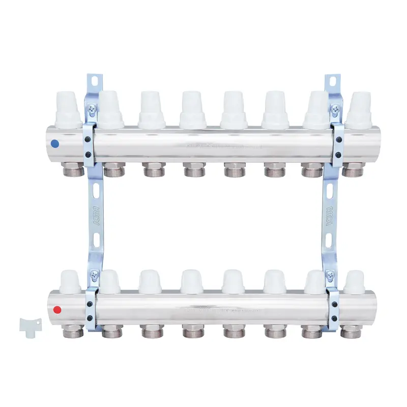 Колектор ICMA Арт. K005 з запірними кранами з мікрометричним регулюванням призначений для розподілу теплової енергії в системі опалення. Дана установка застосовується в системах радіаторного опалення. Регулювання витрати мережної води по контурах - ручна або терморегулююча. Запірні крани з мікрометричним регулюванням дозволяють перекривати подачу води і регулювати витрату мережної води в кожному контурі опалення. Колектор має 8 виходів.