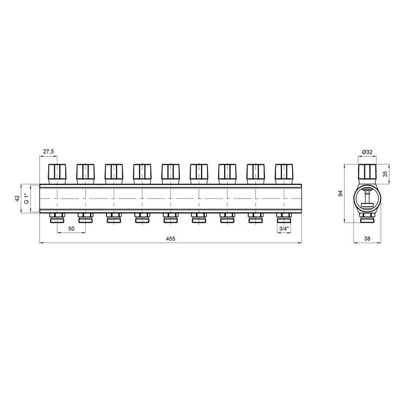 Колектор Icma з регулювальними вентилями 1" 9 виходів №1105 (Blue) призначений для розподілу потоку в системах гарячого та холодного водопостачання. Колектор з ручками управління синього кольору.