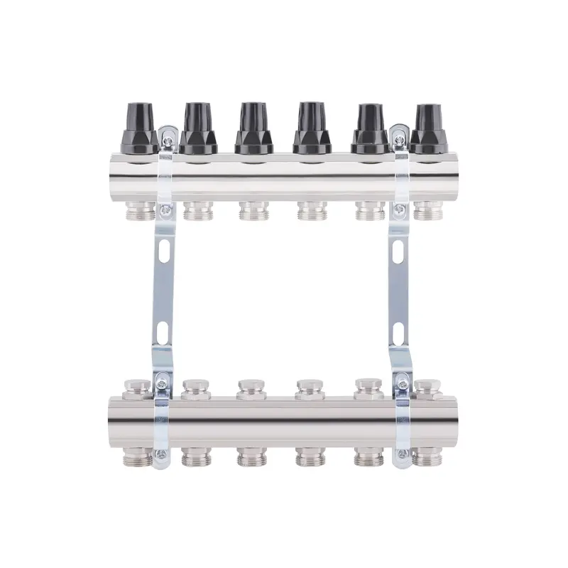 Колектор SD Forte 1" на 6 виходів знадобиться при облаштуванні систем опалення. Гребінка відповідає за розподіл теплоносія в опалювальних петлях. Виріб виконаний з латуні, складається з верхньої та нижньої колекторних балок, для кріплення до стіни або в колекторній шафі укомплектований двома кронштейнами. Розмір для під’єднання до системи — 1 дюйма, до петель — 3/4". Замість ручок регулювання на термоклапани можна встановити сервоприводи 30х1,5.