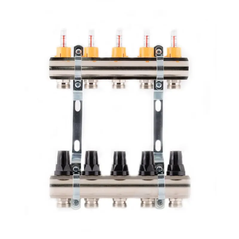Колектор з витратомірами SD Forte 1" на 4 виходи — це колекторні латунні балки (подавальна з витратомірами та зворотного ходу з термостатичними клапанами) і два кронштейни для кріплення до стіни або в шафі. На термоклапанах — ручки управління. Є можливість під’єднання сервоприводів 30х1,5 (вони не входять в комплектацію). Пристрій здійснює рівномірний розподіл теплоносія по контурах системи «тепла підлога».
