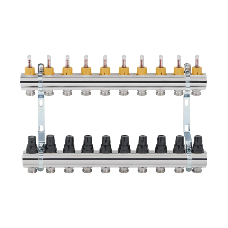 Колектор з витратомірами SD Forte 1" на 10 виходів — пристрій для забезпечення рівномірного розподілу теплової енергії в контурах системи «тепла підлога». Колекторні балки зроблені з латуні. На лінії подачі встановлені витратоміри, що дозволяють регулювати витрату теплоносія. Зворотний колектор забезпечений термостатичними клапанами. Ручки термоклапанів можна замінити сервоприводами 30x1,5. Різьба для підключення петель обігріву зовнішня, 3/4 дюйма.