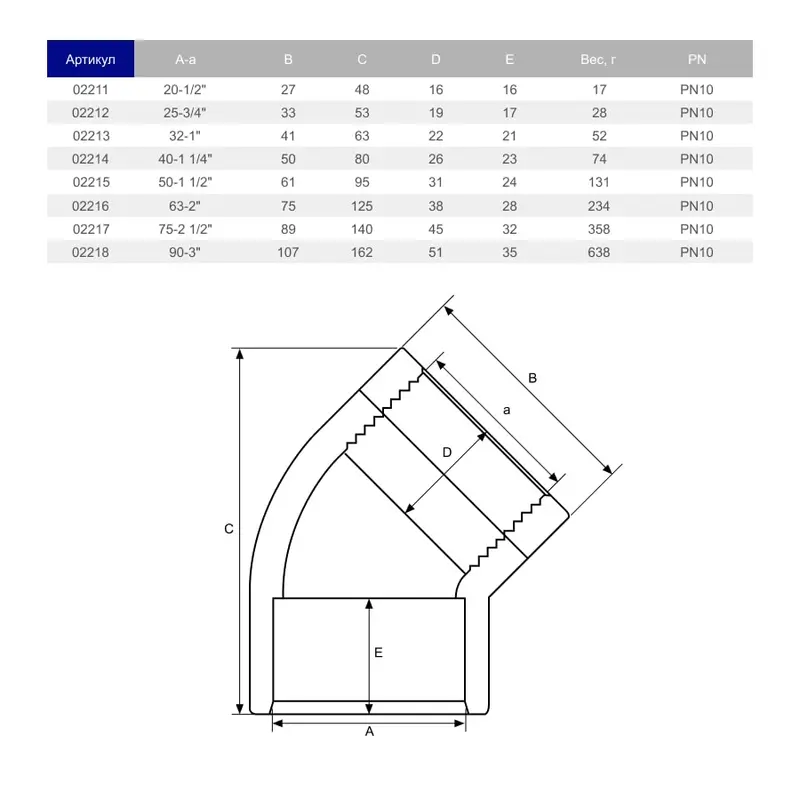 Коліно перехідне 45° ПВХ Hidroten 1002212, внутрішня різьба, d25 мм, 3/4"