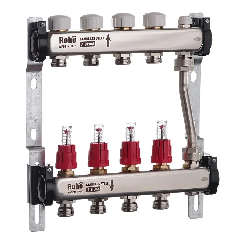 Коллектор с расходом. и термостатическими клапанами с байпасом Roho R814-04 - 1"х 4 вых. (RO0047)