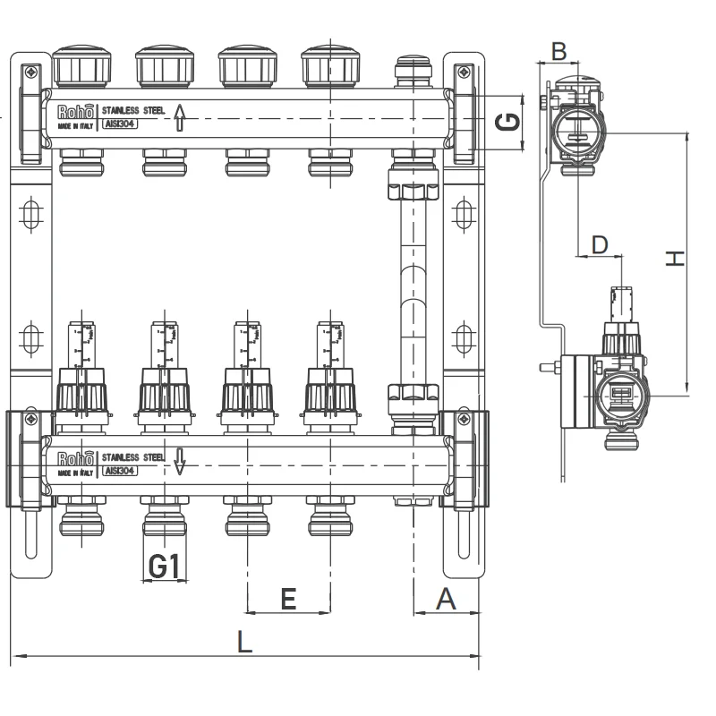 Коллектор с расходомерами и термостатическими клапанами с байпасом Roho R814-09 - 1"х 9 вых. (RO005