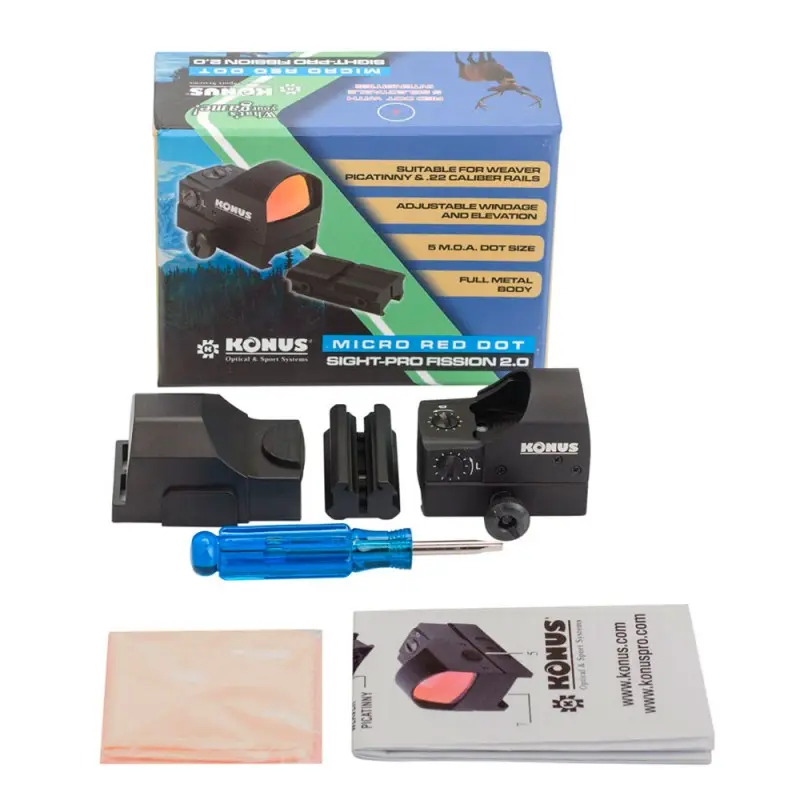 Ультра-компактный коллиматор открытого типа Konus SIGHT-PRO Fission 2.0 предназначен для использования как с легким ручным огнестрельным оружием, так и с дробовиками. Крепится на планку Вивер/Пиккатини, а с входящим в комплект переходником может быть установлен и на хвост «ласточки». Допускает возможность крепления на боковой планке.