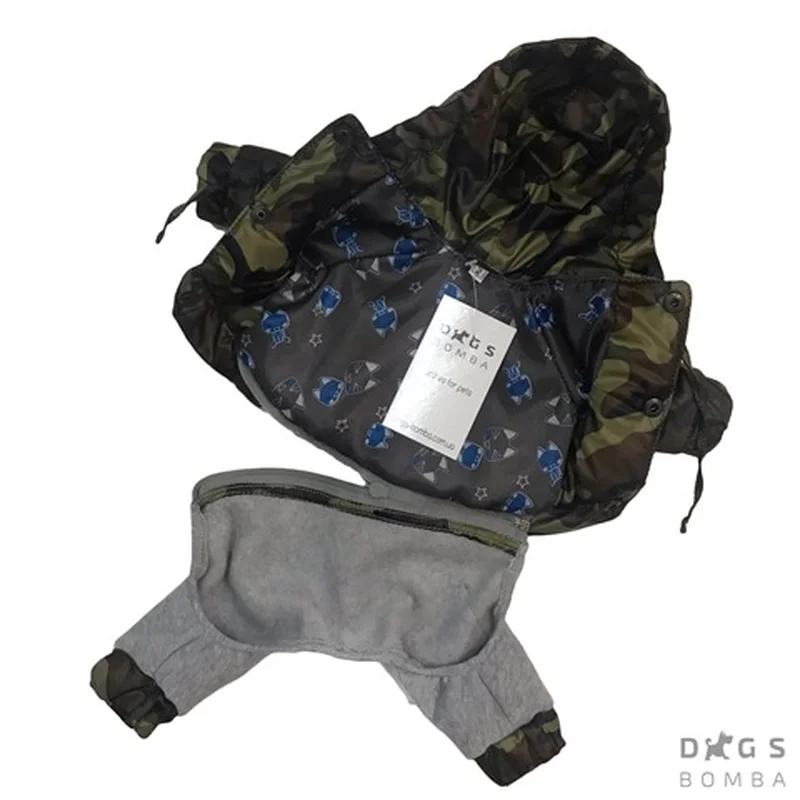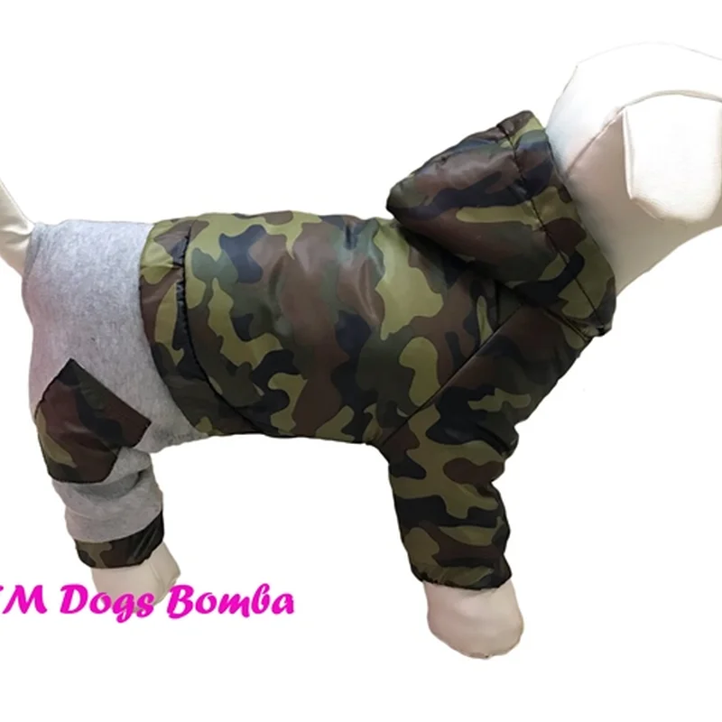 ексклюзивна модель комбінезона трансформера; тканина куртки водовідштовхувальна плащівка; наповнювач куртки тонкий синтепон; підкладка нейлон; штани котон 100%; штани пристібаються потайний змійкою; капюшон на затяжках; рукава, штани, пояс на резинці; на шиї проріз для повідця, модель унісекс.