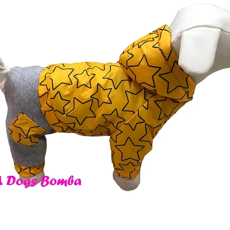 ексклюзивна модель комбінезона трансформера; тканина куртки водовідштовхувальна плащівка; наповнювач куртки тонкий синтепон; підкладка нейлон; штани котон 100%; штани пристібаються потайний змійкою; капюшон на затяжках; рукава, штани, пояс на резинці; на шиї проріз для повідця, модель унісекс.