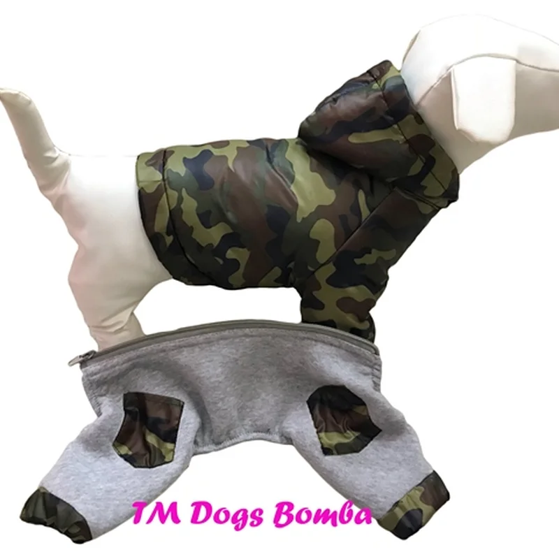 ексклюзивна модель комбінезона трансформера; тканина куртки водовідштовхувальна плащівка; наповнювач куртки тонкий синтепон; підкладка нейлон; штани котон 100%; штани пристібаються потайний змійкою; капюшон на затяжках; рукава, штани, пояс на резинці; на шиї проріз для повідця, модель унісекс.