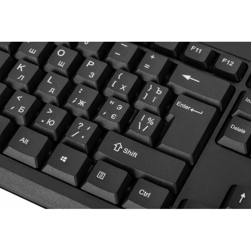Повнорозмірний комплект миша та клавіатура класичної форми, якою зручно користуватися протягом тривалого часу. Пріоритетне нанесення українських літер на клавішах. Комбінація м’якої Soft-touch поверхні з декоративними глянцевими вставками, з боків, надають миші оригінальний зовнішній вигляд.