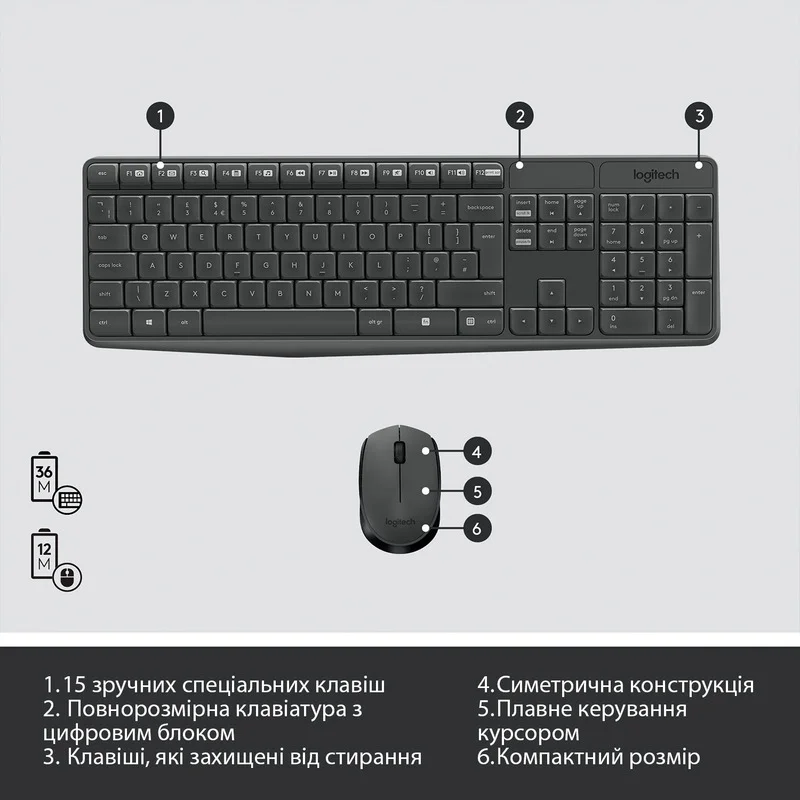 Комплект (клавіатура, мишка) бездротовий Logitech MK235 ENG/UKR Grey USB (920-007931)
