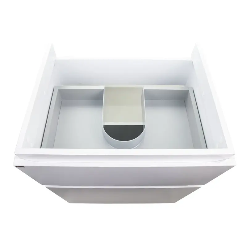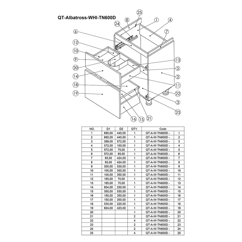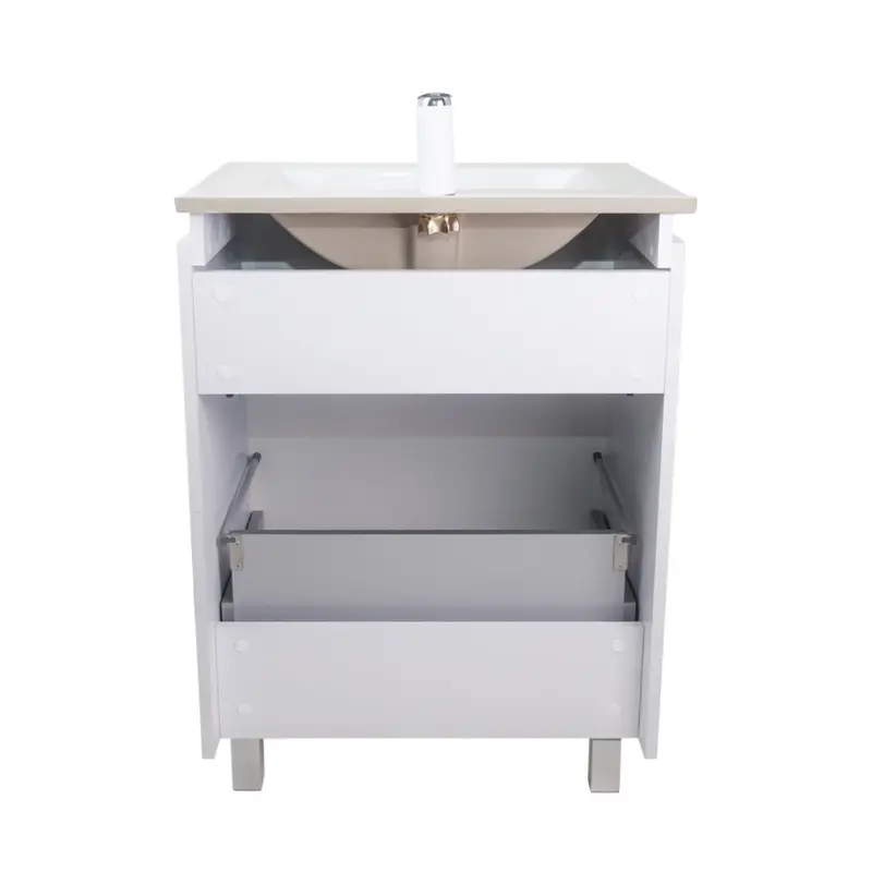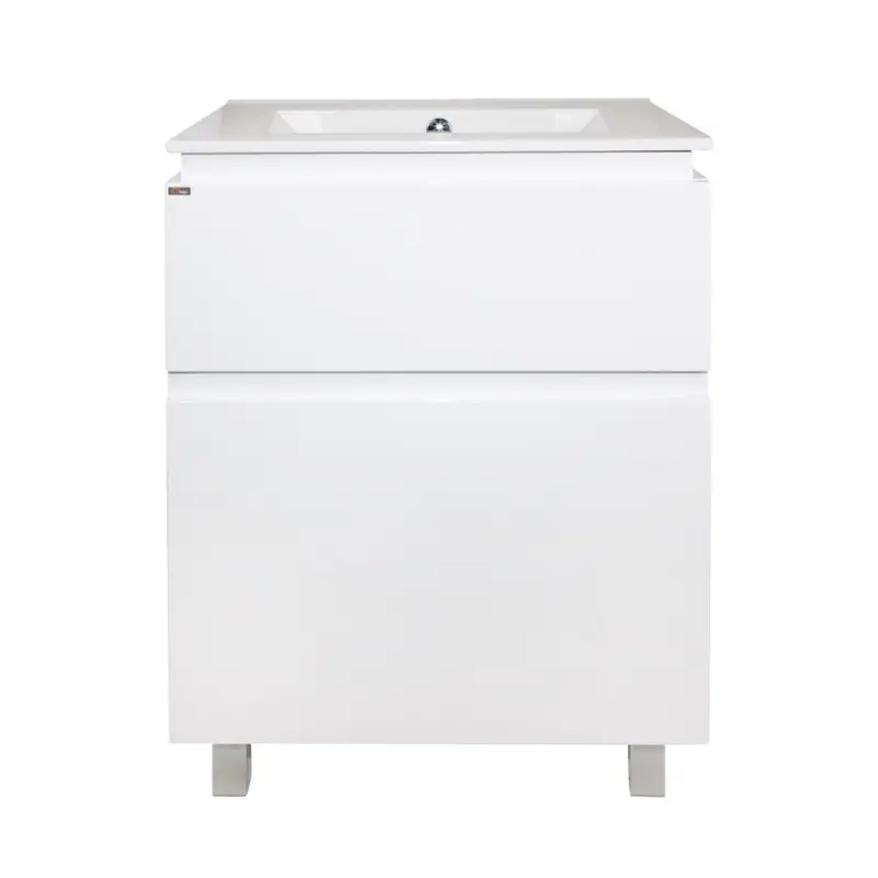 Підлогова тумба з раковиною Qtap Albatross QT0171TN600D3060CW виконана з отвором під сифон. У комплекті чотири хромовані ніжки з пластика з металевим каркасом. Корпус тумби виготовлений з ДСП, з двошаровою ламінацією білого кольору, фасадна частина з МДФ з глянцевим покриттям. Тумба оснащена двома висувними ящиками з механізмом доводчика. Виріб виконано в елегантному лаконічному стилі, який доповнить раковину і впишеться в дизайн будь-якої ванної кімнати.