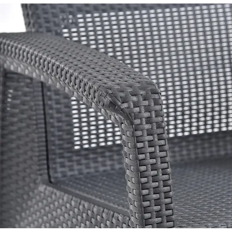 Садові меблі HECHT SIERRA - це розкішний набір, який складається з дивана, двох стільців та столика зі штучного ротангу з сидінням. Цей набір виготовлений з високоміцного поліпропілену, що гарантує його довговічність та стійкість до негоди та ультрафіолетового випромінювання. Також він ідеально підходить для використання у вологих умовах.