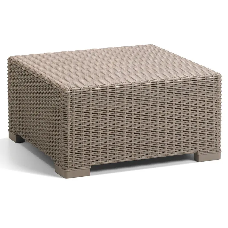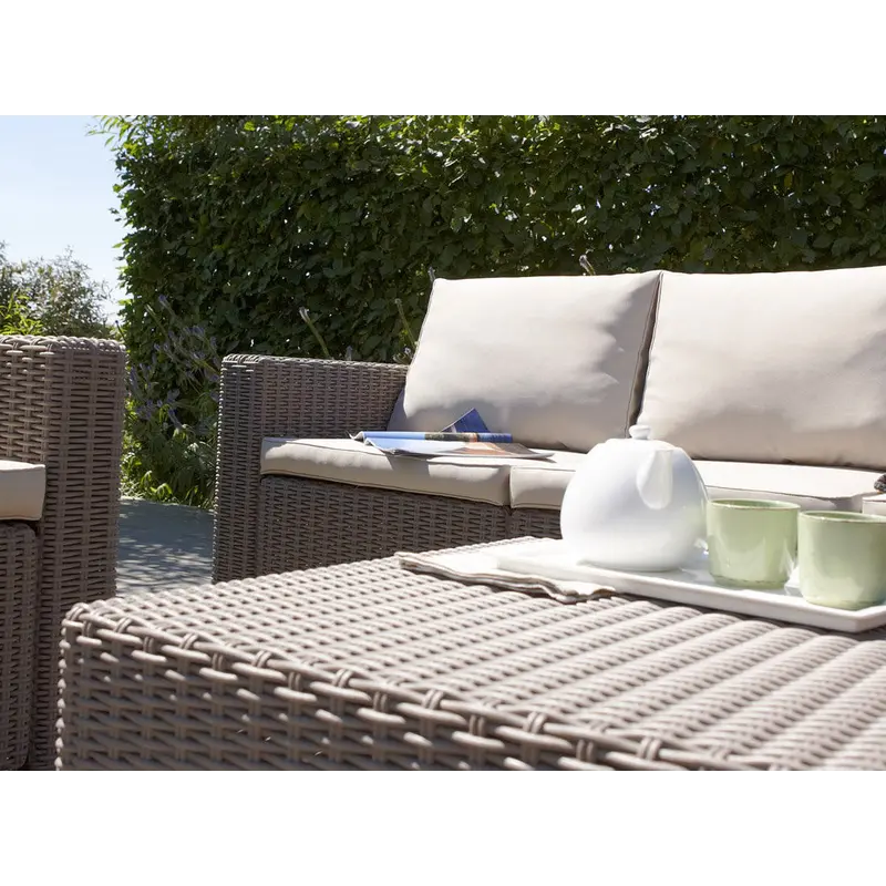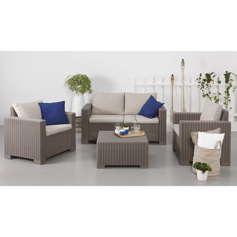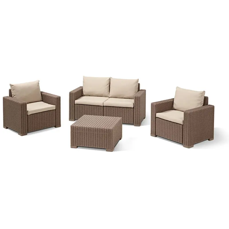 Комплект меблів California - меблі представлена у кольорі капучіно з бежевими подушками, що виділяє його з усієї лінії меблів Keter. Особливу комфортабельність комплекту меблів з пластика під штучний ротанг California надають висока спинка і наявність подушок спинки. Диван досить міцний - він витримує вагу до 110 кг на одне посадочне місце.
