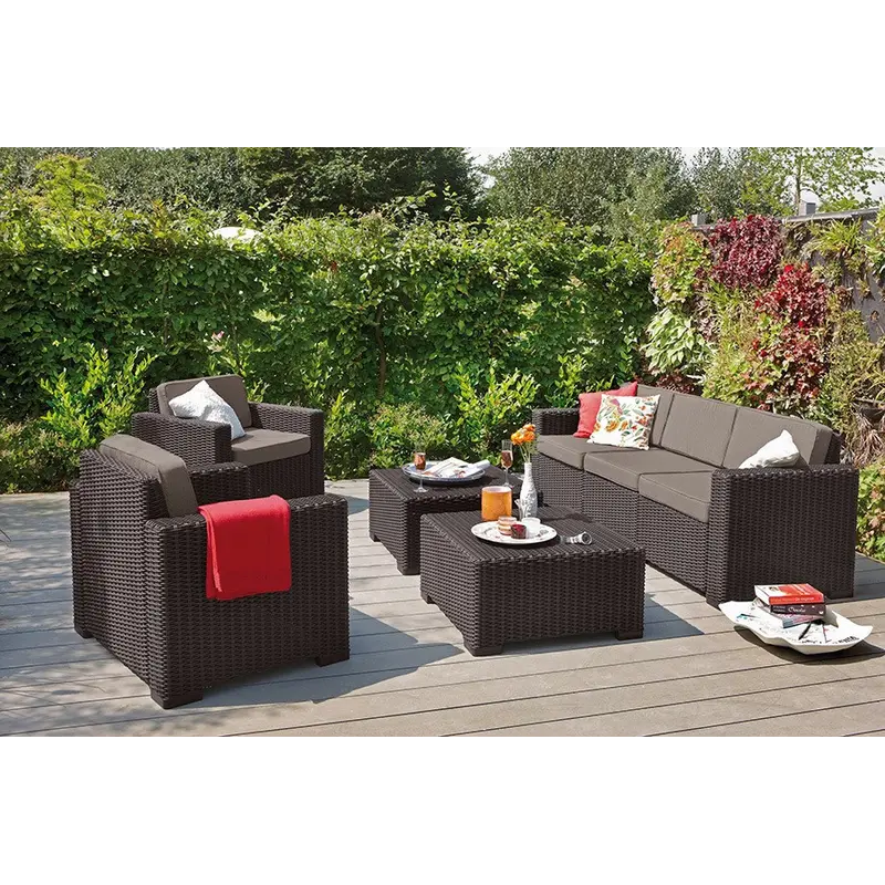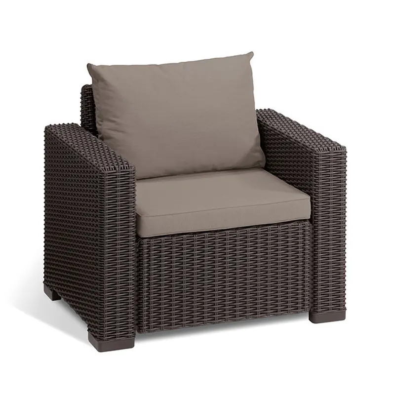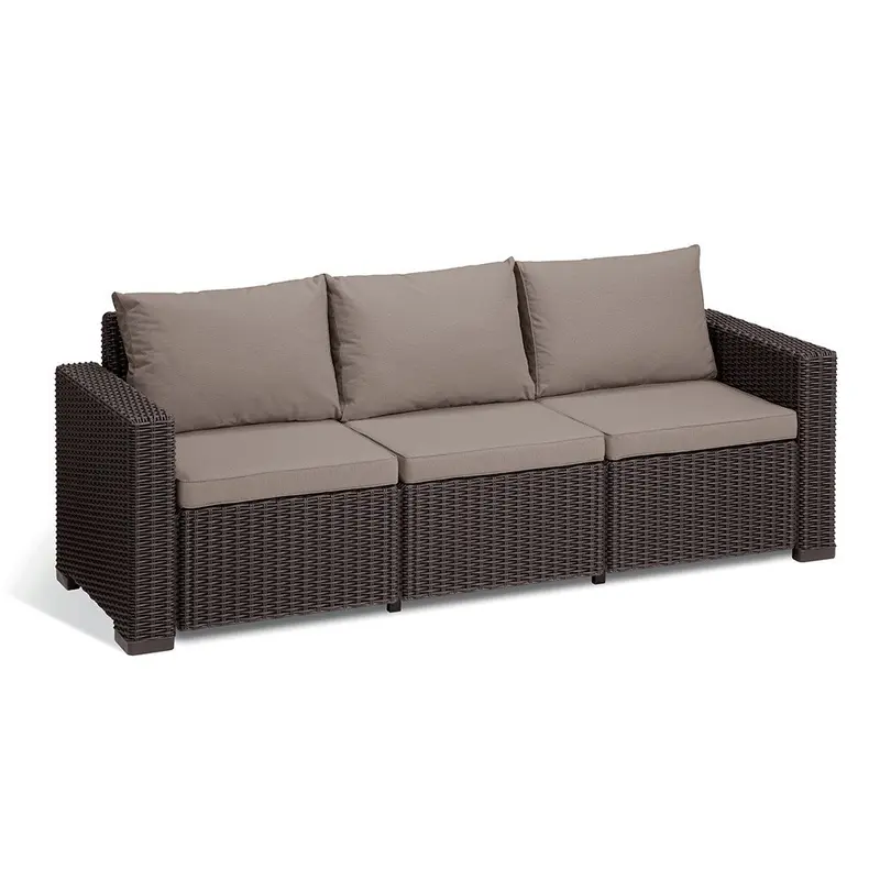 Комплект меблів California представлений в кольорі капучіно з бежевими подушками, що виділяє його з усієї лінійки меблів Keter. Особливий комфорт комплекту меблів з пластику, що імітує штучний ротанг, надають високу спинку і наявність подушок спинки. Диван досить великий і місткий, витримує вагу до 110 кг на одне посадочне місце.