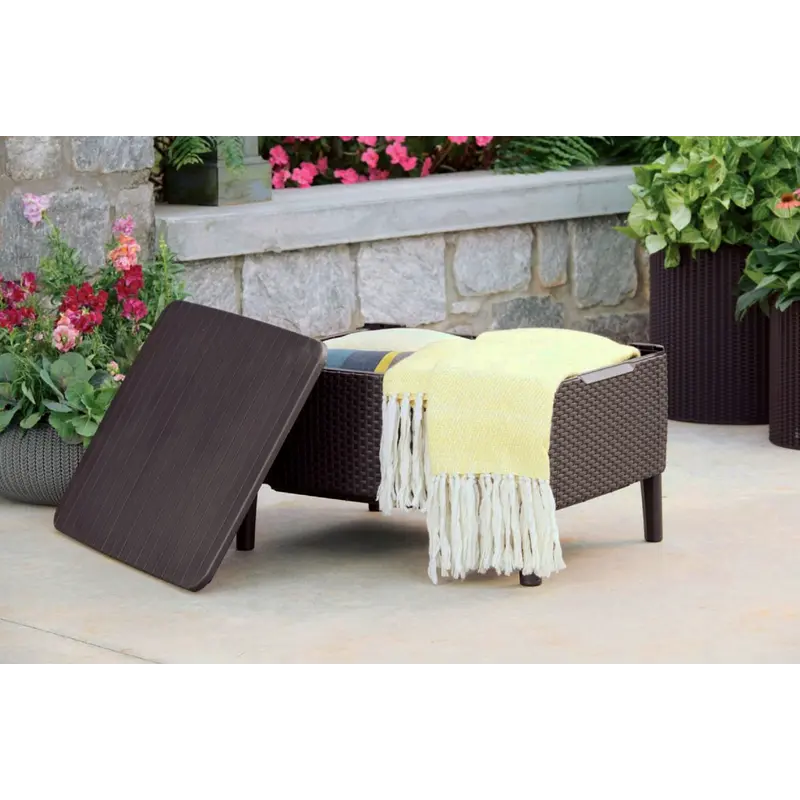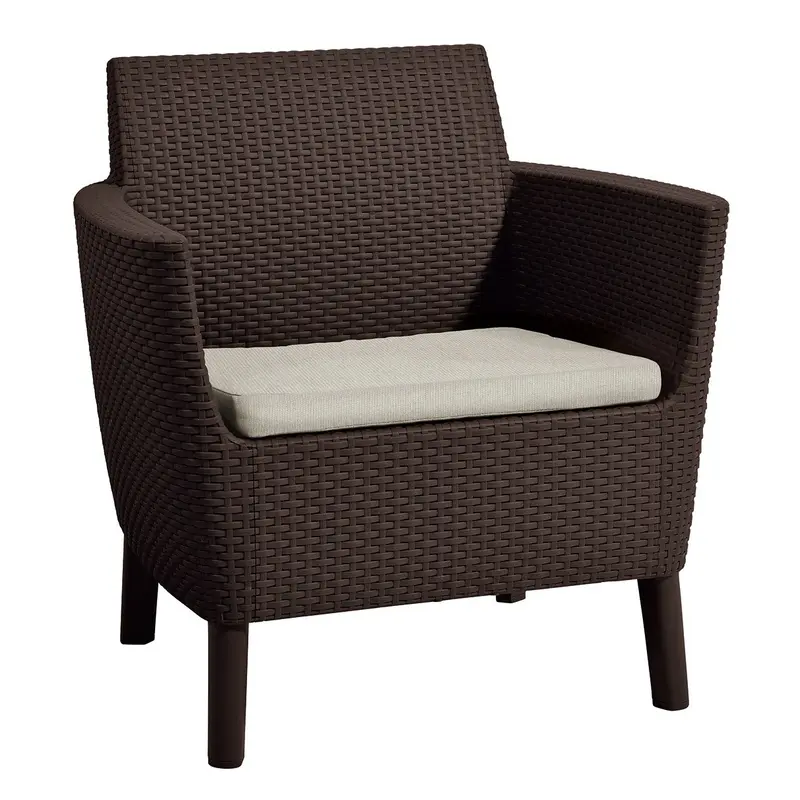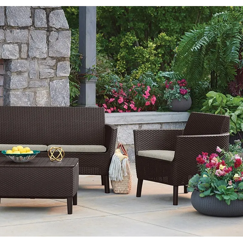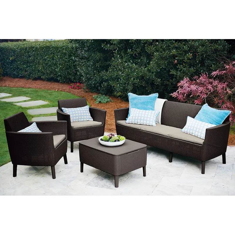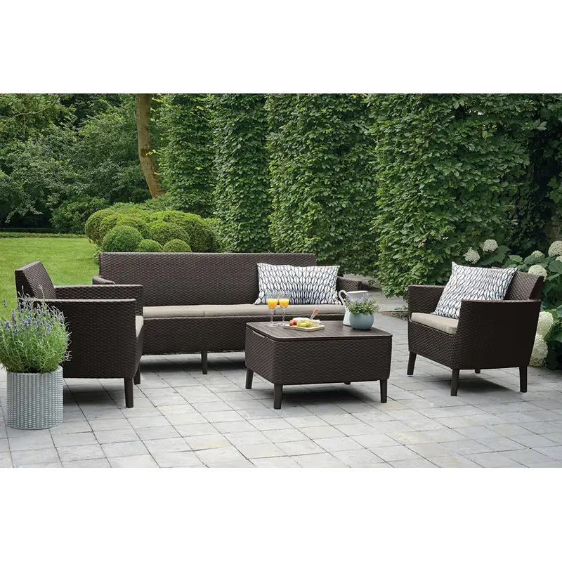 П'ятимісний Комплект садових меблів Keter Salemo 3 seater set у приємному коричневому кольорі* та скандинавському стилі чудово підійде для облаштування будь-якого відкритого простору — саду, тераси, зони барбекю, веранди, заходів на свіжому повітрі, балконної зони та багато іншого. До складу набору входять 2 комфортні крісла, тримісний диван, 5 подушок та стіл-скриня.