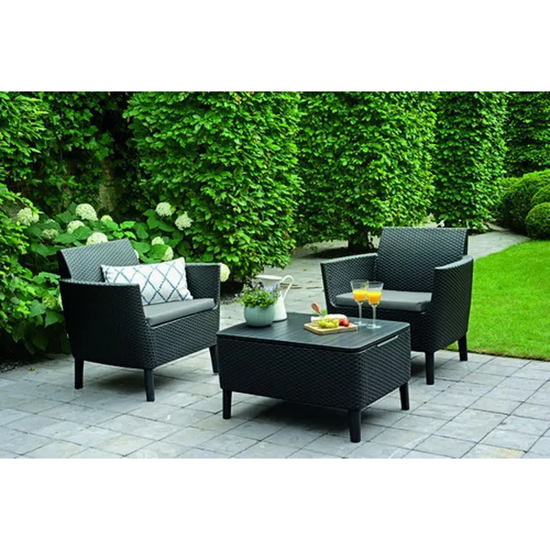 Сучасна, обтічна форма, комфорт та високу якість є основними перевагами балконного набору Salemo. До складу комплекту входять два широких крісла і столик з функцією коробки для зберігання. Фактура поверхні імітує натуральне ротанга плетіння, тим самим підтверджує естетичну цінність продукту. Меблі легко містити в чистоті, вони прості в монтажі і стійкі до впливу несприятливих погодних умов.