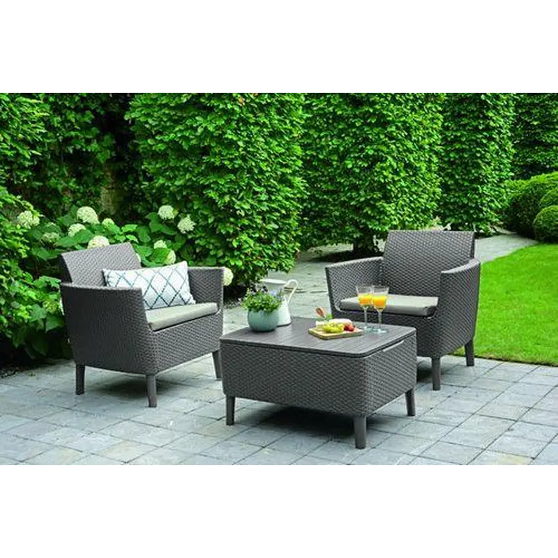 Сучасна, обтічна форма, комфорт та висока якість є основними перевагами балконного набору Salemo. До складу комплекту входять два широких крісла і столик з функцією коробки для зберігання. Фактура поверхні імітує натуральне ротангове плетіння, тим самим підтверджує естетичну цінність продукту. Меблі легко підтримувати в чистоті, вони прості в монтажі і стійкі до впливу несприятливих погодних умов.