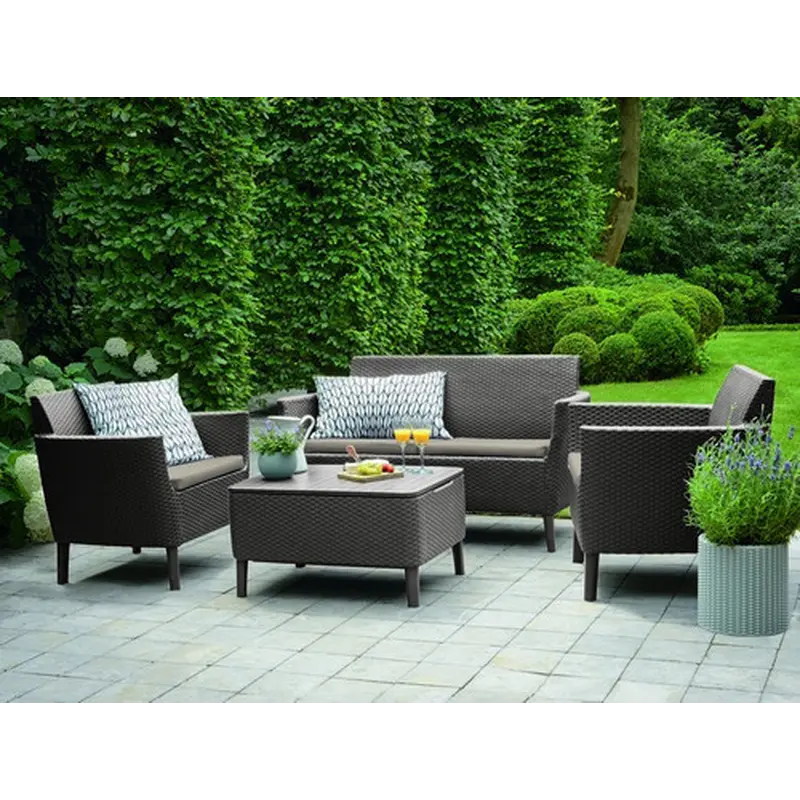 Сучасна фактура, елегантність та комфорт використання - це основні ознаки, що характеризують комплект меблів Salemo. Комплект складається з широкого, зручного двомісного дивана, двох крісел і столика з функцією коробки для зберігання. Меблі характеризуються оригінальною структурою поверхні, що імітує натуральне ротанговое плетіння. Комплект ідеально підійде для обстановки садів, терас і оформлення інтер'єру. Меблі в модному сьогодні стилі дуже прості в монтажі і легко тримаються в чистоті. Стійка до впливу несприятливих атмосферних умов і ультрафіолетових променів