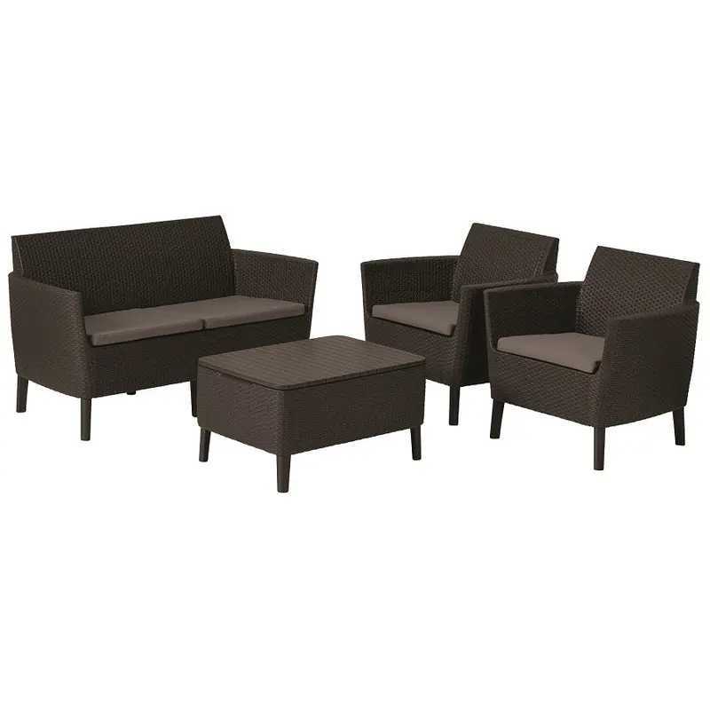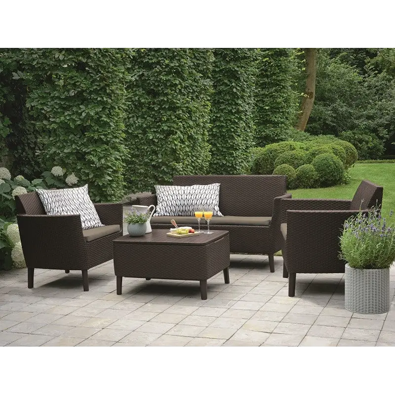 Сучасна фактура, елегантність та комфорт використання - це основні ознаки, що характеризують комплект меблів Salemo. Комплект складається з широкого, зручного двомісного дивана, двох крісел і столика з функцією коробки для зберігання. Меблі характеризуються оригінальною структурою поверхні, що імітує натуральне ротанговое плетіння. Комплект ідеально підійде для обстановки садів, терас і оформлення інтер'єру. Меблі в модному сьогодні стилі дуже прості в монтажі і легко тримаються в чистоті. Стійка до впливу несприятливих атмосферних умов і ультрафіолетових променів.