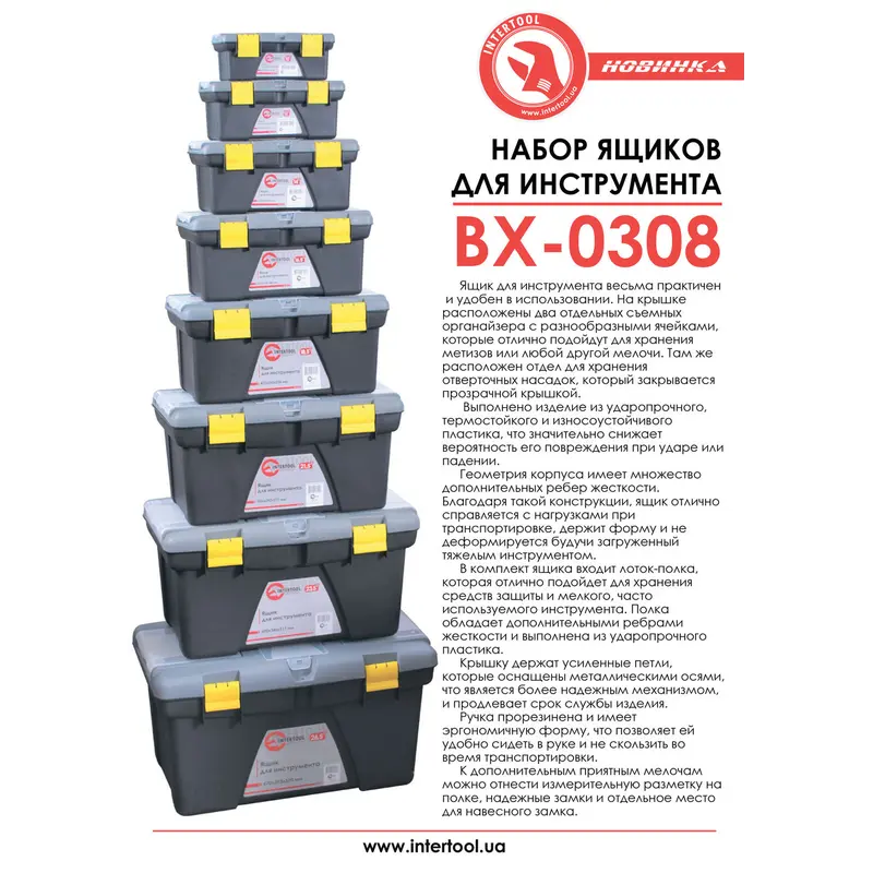Комплект ящиків для інструментів INTERTOOL BX-0308 складається з 8 одиниць: - ВХ-0310 розміром 10", - ВХ-0312 розміром 12", - ВХ-0314 розміром 14", - BX-0316 розміром 16,5", - BX-0318 розміром 18,5", - BX-0321 розміром 21,5", - BX-0323 розміром 23,5", - BX-0326 розміром 26,5". Ящики виготовлені з високоякісного ударостікого пластика, оснащені двома об'ємними органайзерами з прозорою пластиковою кришкою для різних дрібниць, зручною двокомпонентною прогумованою ручкою. У кожному ящику є знімний лоток для губцевого та іншого ручного інструменту, який часто використовується в роботі. Ящики замикаються на надійні пластикові замки. У кришці ящиків передбачена провушина для навісного замка. Комплект ящиків дозволить дбайливо зберігати всі ваші інструменти, дрібні деталі та витратні матеріали, при цьому економить простір в гаражі або майстерні. В даному комплекті Ви завжди зможете підібрати ящик необхідного розміру для комфортного транспортування потрібного інструменту. Правильна організація простору для зберігання істотно скорочує час на пошуки потрібного інструменту або деталі. Ящики для інструментів, органайзери, системи зберігання №1 в Україні. За результатами незалежного рейтингового дослідження у рамках проекту Українська Народна Премія 2021 року.