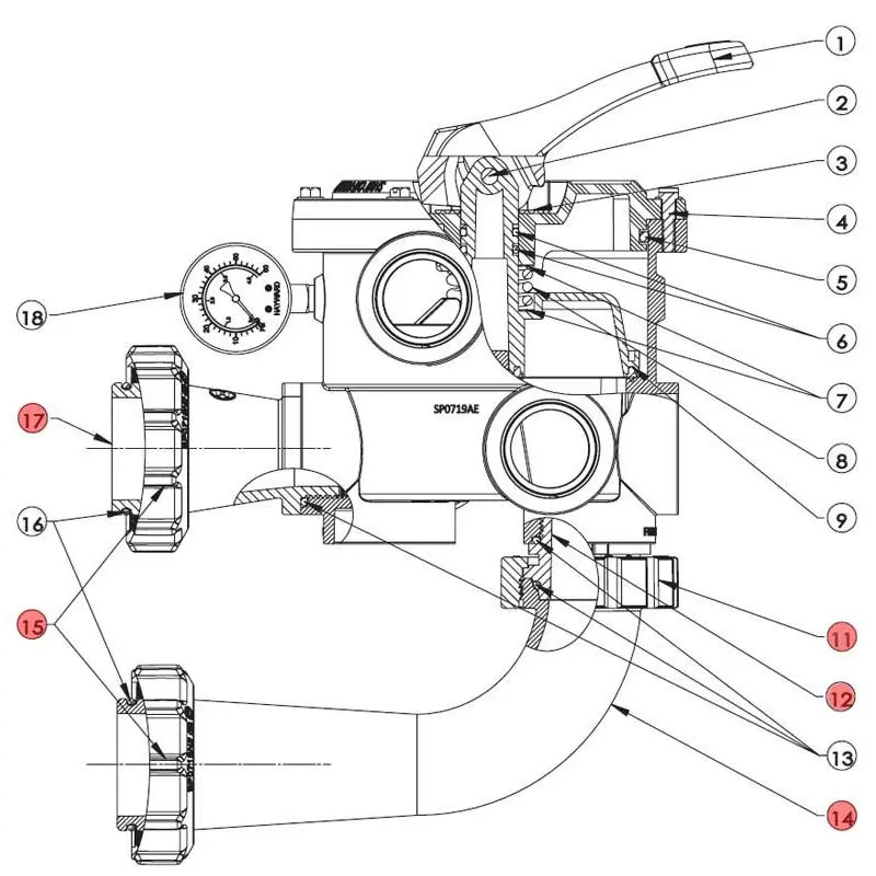 Комплект з'єднань для 6-ти поз. вентиля Hayward SPX0719KIT. Комплект складається з деталей (див. малюнок): 11, 12, 14, 15, 17.