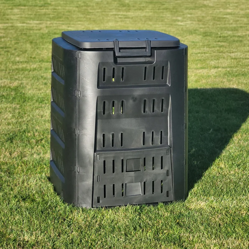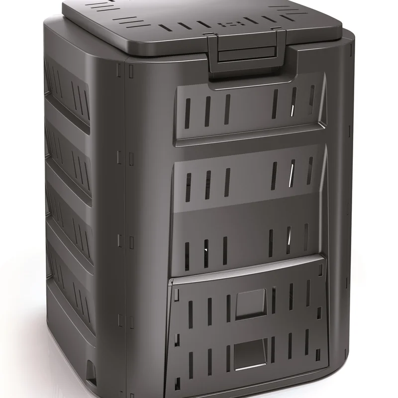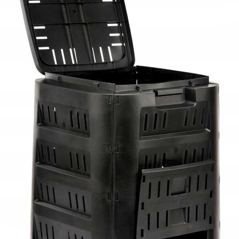Бічні стінки виробу мають оптимальну кількість вентиляційних отворів, що забезпечують правильну циркуляцію повітря, поліпшуючи і стабілізуючи процес біорозкладу, не поширюючи при цьому неприємні запахи навкруги. Верхня стінка, яка слугує кришкою, зручно відкривається для завантаження відходів, а також обладнана ручкою із механізмом блокування відкриття, що обмежує доступ непроханим гостям, таким як птахи, коти чи собаки. Для зручного забору компосту слугують два нижні бічні лючки із протилежних боків виробу.