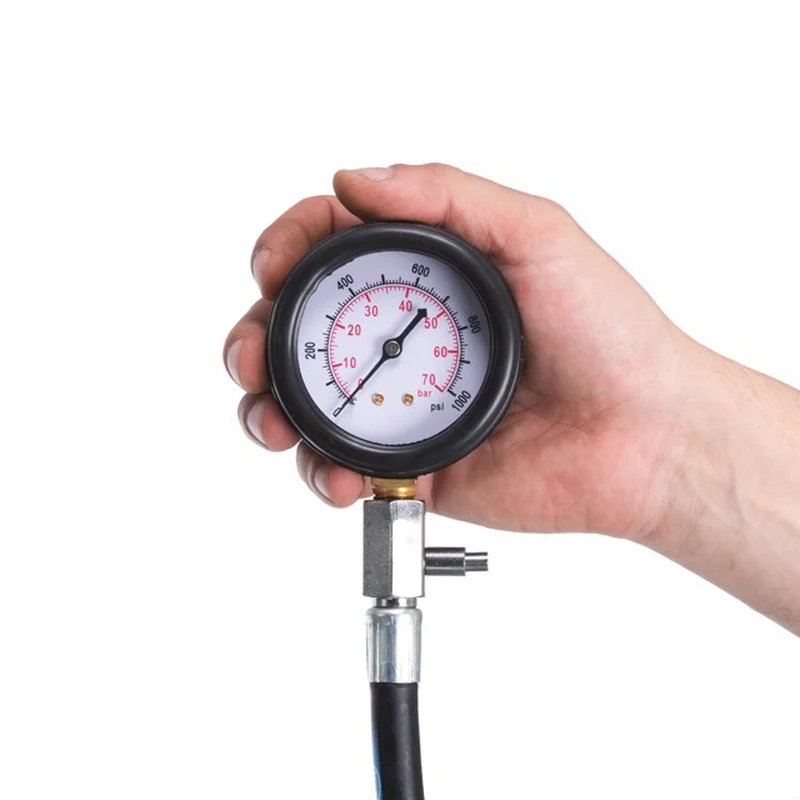 Міцні елементи манометра у прогумованому корпусі з армованим шлангом забезпечують надійне утримання тиску. Завдяки гнучкості шланга компресометром можна працювати у важкодоступних місцях з обмеженим доступом. Після вимірювання тиск скидається натисканням на бічний клапан, а стрілка манометра встановлюється на нульове значення шкали.