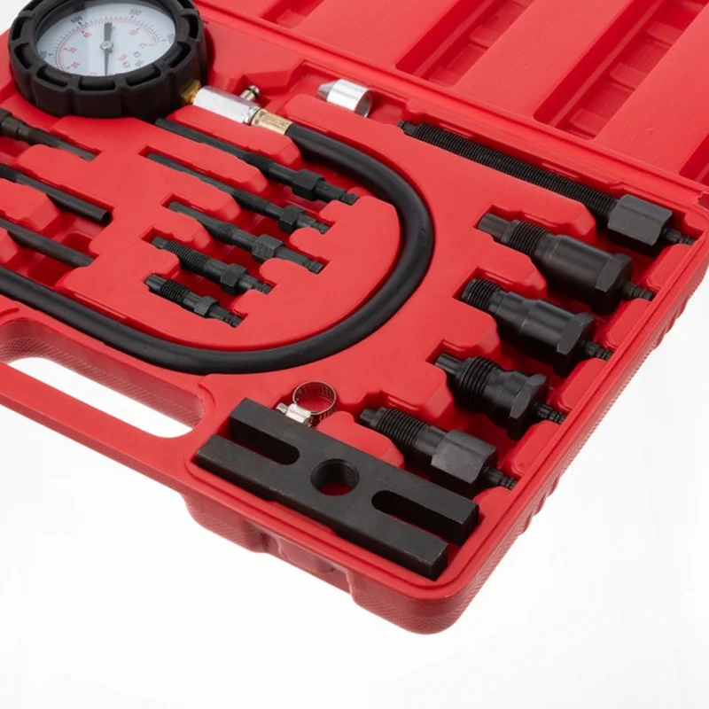 Великий манометр з показниками, легко зчитується для комфортної роботи, має дві найбільш популярні шкали вимірювання: 0-70 Bar і 0-1000 PSI. Інструмент укомплектований в міцний пластиковий кейс із персональними посадковими місцями під кожен елемент. Два замки забезпечують повну безпеку комплекту, а наявність ручки - зручне транспортування.