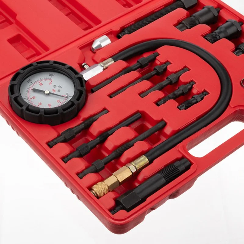 Протиударний корпус манометра разом з армованим шлангом забезпечують надійне утримання тиску. Завдяки гнучкості шланга компресометром можна працювати у важкодоступних місцях з обмеженим доступом. Після вимірювання тиск скидається натисканням на бічний клапан, а стрілка манометра встановлюється на нульове значення шкали.