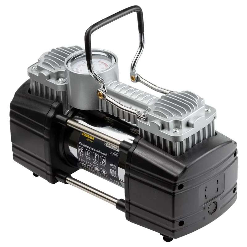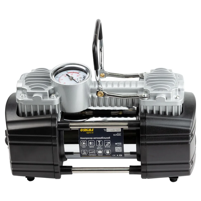 Компресор автомобільний 12В 300Вт 25А 60л/хв 10бар сумка перехідник на клеми SIGMA (6170281) використовується для підкачки колес автомобіля. За допомогою перехідника від прикурювача на клеми і насадок, які поставляються в комплекті, ви можете підключити компресор безпосередньо до акумулятора і використовувати у побуті для накачування спортивного інвентарю.