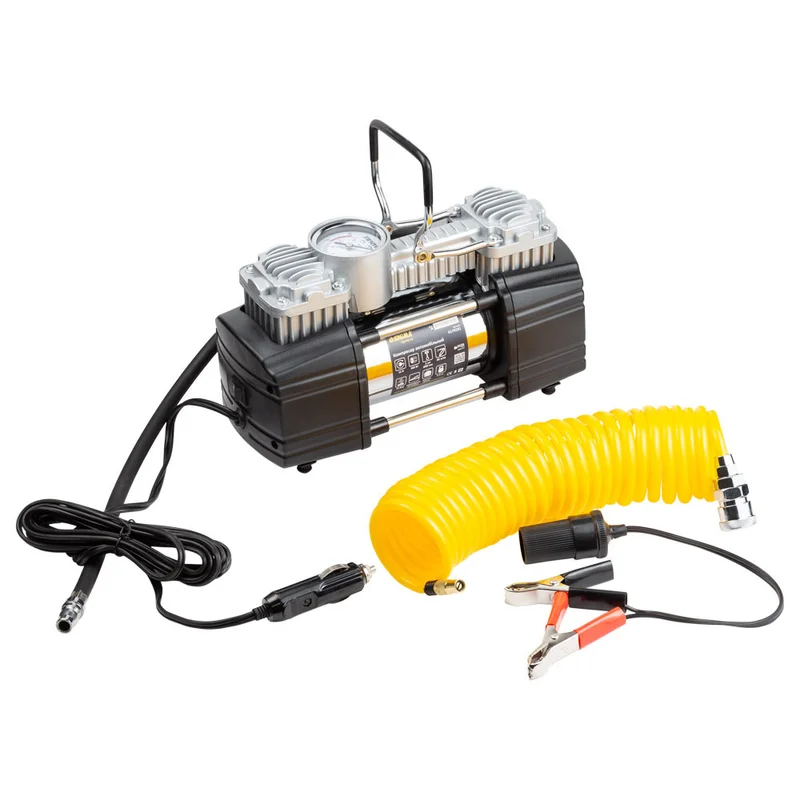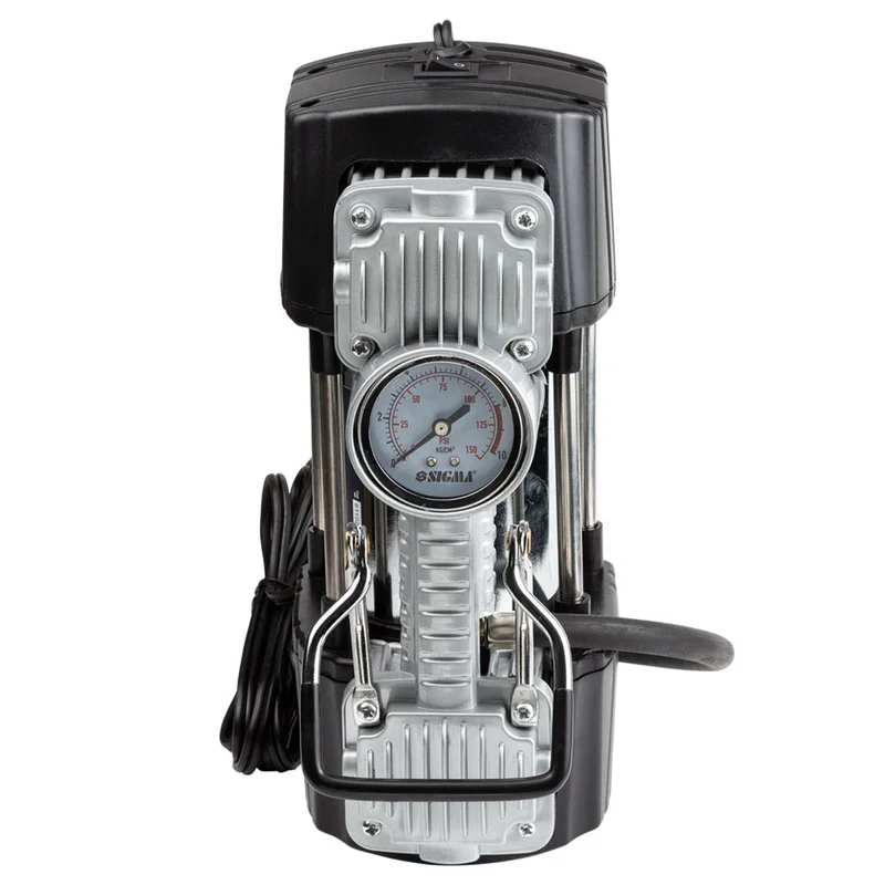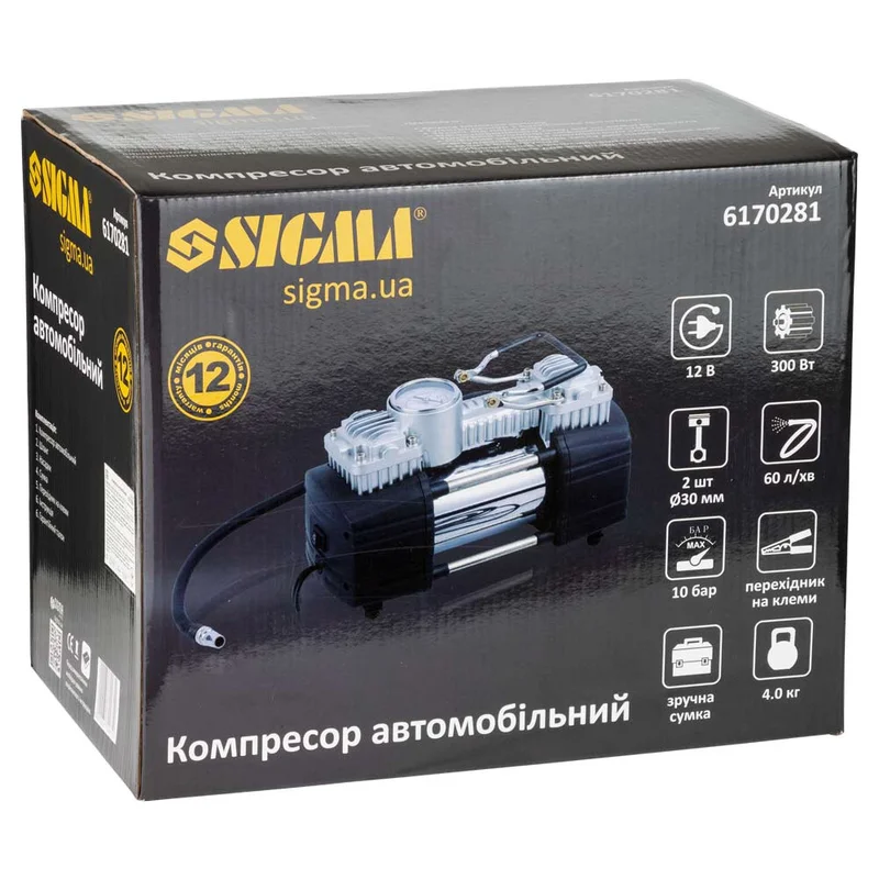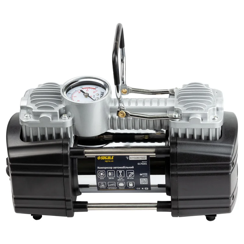 Компресор автомобільний 12В, 300Вт, 60л/хв, 10бар SIGMA (6170281) Компресор автомобільний використовується для підкачки коліс автомобіля. За допомогою перехідника від прикурювача на клеми і насадок, які поставляються в комплекті, ви можете підключити компресор безпосередньо до акумулятора і використовувати в побуті для накачування спортивного інвентарю. Переваги: Мідна обмотка ротора;Електродвигун з постійними магнітами;Захист від перегріву;Насос поршневого типу, не вимагає мастила;Повітряні клапани з нержавіючої сталі;Робочий циліндр з алюмінієвого сплаву;Візуальний контроль тиску для накачування шин;Міцна конструкція;Мінімальний рівень вібрації та шуму;Зручна сумка для зберігання і перенесення;Кількість поршнів - 2;Манометр - аналоговий. Комплектація: КомпресорШлангФітингиСумкаПерехідник на клемиІнструкціяГарантійний талонУпаковка