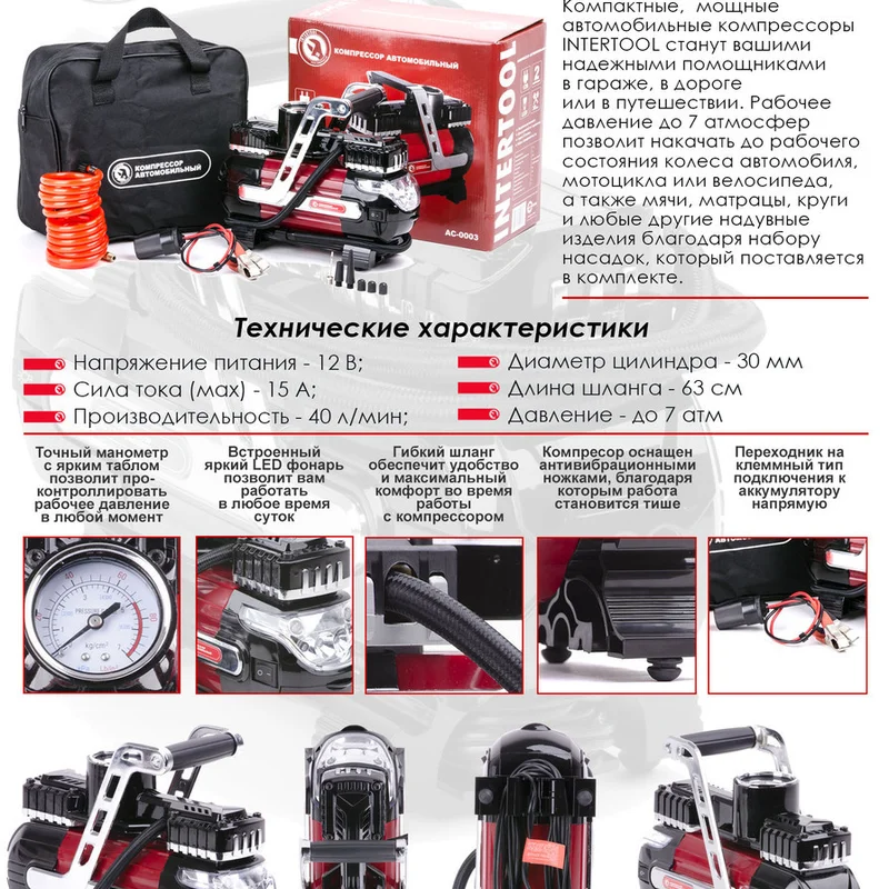 Призначення Оптимальний показник тиску в шинах – обов'язкова умова безпеки в дорозі та довговічній експлуатації шин. Автомобільний компресор INTERTOOL AC-0003 здатний накачати за лічені хвилини колесо вашого авто до необхідного тиску. Оскільки правильний показник тиску допомагає продовжити термін служби шин, зменшує витрату пального та загалом покращує їзду. Продуктивність Максимальний тиск 7 бар, швидкість нагнітання повітря 40 л/хв на виході, це дозволяє ефективно виконувати різноманітні завдання. Наприклад, накачати колесо R13 до 2 бар компресор зможе за 1-2 хвилини. Універсальність Окрім іншого, робочі показники компресора дозволяють накачати до робочого стану колеса мотоциклів або велосипеда, а також м'ячі, матраци, надувні дитячі круги та будь-які інші вироби, у тому числі завдяки набору насадок, який постачається в комплекті. Мобільний та зручний Компресор має дуже скромні габарити, тому разом із комплектом та сумкою поміститися навіть у невеликих багажниках. Живлення здійснюється від прикурювача автомобіля 12В, тому ви зможете легко накачати колесо в дорозі. Довжина мережевого дроту 3 метри. У комплекті також передбачено перехідник з клемами для роботи безпосередньо від акумулятора. Вбудований LED-ліхтар допоможе зручно накачати колесо навіть у темну пору доби, працює як від прикурювача, так і від батарейок ААА типу.. Загальні рекомендації 1) Перш ніж увімкнути компресор краще завести двигун, так ви не розрядите акумулятор. 2) Контролюйте тиск накачування за манометром, загальний стандарт автомобільних шин 2 - 2,5 атм. 3) Давайте компресору охолонути, час безперервної роботи не повинен перевищувати 5-10 хвилин.