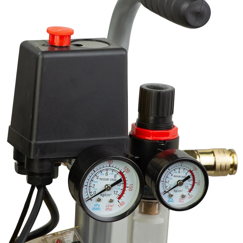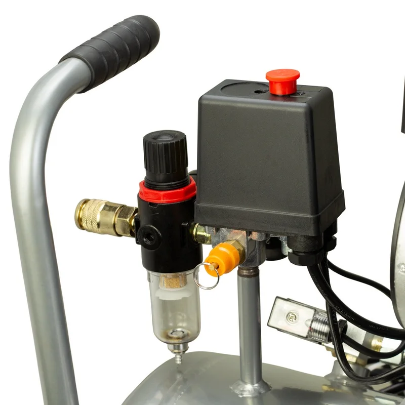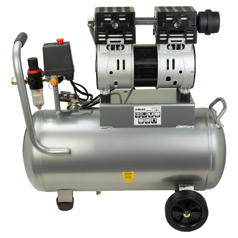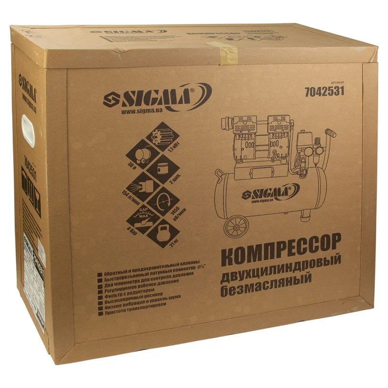 Компресор двоциліндровий безмасляний 1.1 кВт 154л/хв 8бар 30л Sigma 7042531 Компресор двоциліндровий безмасляний Sigma 7042531 призначений для нагнітання стисненого повітря з подальшою його подачею під тиском в різні типи пневмоінструменту.Дана модель компресора працює без масла, тому не вимагає технічного обслуговування, контролю та доливці масла.Відрізняється чистим повітрям, яке не містить будь-яких домішок. Колеса забезпечують стійке положення на поверхні, а гумова подушечка знижує рівень вібрації. Переваги:Зручно розташований пробка дозволяє легко і швидко злити конденсат з ресивераВстановлено універсальний быстроразъемный латунний коннектор діаметром ¼ Встановлений фільтр з редукторомДва манометра дозволяють контролювати тиск всередині ресивера і тиск на виходіВисокоміцний ресиверВстановлено зворотний і запобіжний клапаниРегульоване робочий тискНизький рівень вібрації і шумуПростота транспортування ПАРАМЕТРИ:Артикул : 7042531Гарантія, міс : 12 місяцівПотужність, Вт : 1100Максимальна продуктивність, л/хв : 154Тип : безмасляний КомпресорНапруга, В : 220Частота, Гц : 50Максимально допустимий тиск, бар : 8Об'єм ресивера, л : 30Максимальна кількість обертів, об/хв : 1450Тип упаковки : Картонна коробкаМаса брутто, кг : 21