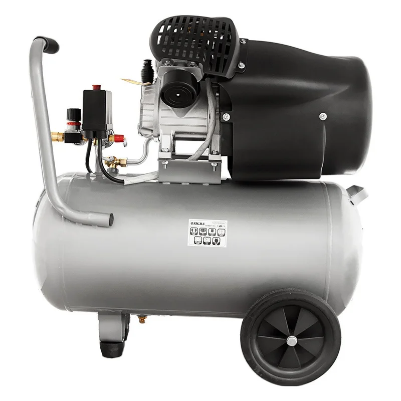 Компресор двоциліндровий 2.2 кВт 412л/хв 8бар 50л Sigma 7043711 Sigma 7043711 - це двоциліндровий масляний компресор з V-подібним двигуном і об'ємом ресивера 50 л для нагнітання стисненого повітря з подальшою його подачею під тиском в різні типи пневмоінструменту і пневмообладнання.. Продуктивність компресора становить 412 л/хв при максимальному робочому тиску 8 атм. Компресори Sigma широко застосовуються для фарбування, продувки, накачування коліс та інших робіт з пневмоінструментом, де використовується стиснене повітря. Це відмінний інструмент як для побутового використання в гаражах, домашніх майстернях і на дачних ділянках, так і для професіоналів на СТО, автосервісах і підприємствах. Компрессор имеет высокую степень защиты и низкий уровень шума. Электродвигатель мощностью 2200 Вт закрыт специальным кожухом, который предотвращает его повреждение и загрязнение. Большой объем ресивера позволяет накапливать больший объем сжатого воздуха, что значительно уменьшает частоту включения двигателя, снижая нагрузку на компрессор и, соответственно, увеличивает срок его службы. Для удобной транспортировки компрессор оснащен ручкой и двумя колесами. А опорные ножки с резиновыми накладками обеспечивают устойчивое положение на поверхности и снижают уровень вибрации. Особенности: Установлены обратный и предохранительный клапаны; Удобно расположенная пробка позволяет легко и быстро слить конденсат из ресивера; Установлены два универсальных быстроразъемных латунных коннектора диаметром 1/4"; Два манометра позволяют контролировать давление внутри ресивера и давление на выходе; Регулируемое рабочее давление; Специальный кожух защищает двигатель от повреждений, грязи, влаги и пыли; Высокопрочный ресивер; Низкий уровень вибрации и шума; Простота транспортировки. Технические характеристики: Мощность, Вт 2200 Тип Компрессор двухцилиндровый Напряжение, В 230 Частота, Гц 50 Уровень шума, дБ 98 Об'єм ресивера, л 50 Максимальний тиск, Бар 8 Вихідний патрубок 1/4" Габаритні розміри: Маса брутто, кг 44.5 Маса нетто, кг 41.5 Довжина, мм 770 Ширина, мм 380 Висота, мм 740 На компресори Sigma надається гарантія 1 рік. Гарантія на ресивер (від наскрізної корозії) - 10 років.