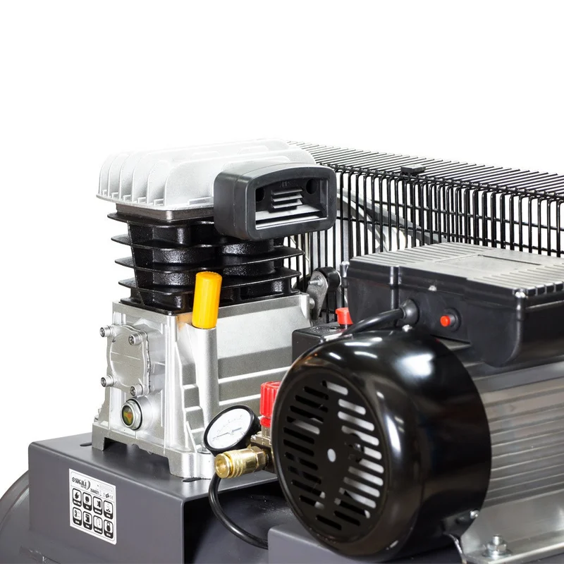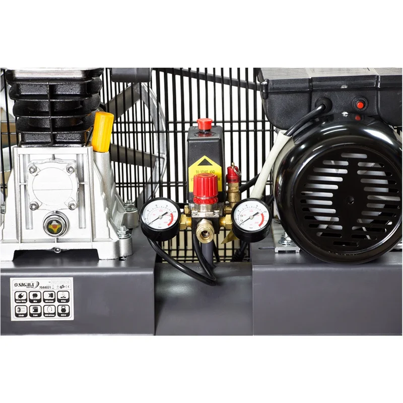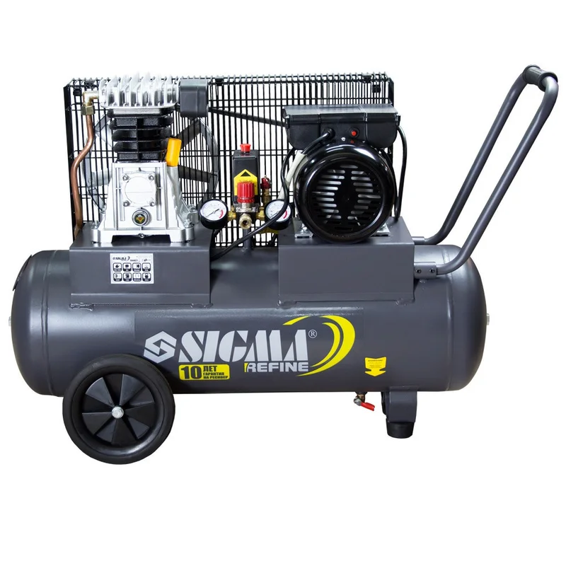 Компресор ремінною двоциліндровий 2кВт 385л/хв 10бар 50л Sigma Refine 7044021 Sigma Refine 7044021 - це двоциліндровий масляний компресор з ремінним приводом для нагнітання стисненого повітря з подальшою його подачею під тиском в різні типи пневмоінструменту і пневмообладнання. Це модель для професійного застосування з об'ємом ресивера 50 л і потужністю 385 л/хв при максимальному робочому тиску 10 атм. Компресори Sigma широко застосовуються для фарбування, продувки, накачування коліс та інших робіт з пневмоінструментом, де використовується стиснене повітря. Це відмінний інструмент як для побутового використання в гаражах, домашніх майстернях і на дачних ділянках, так і для професіоналів на СТО, автосервісах і підприємствах. Компрессор оснащен электродвигателем мощностью 2000 Вт и отличается высокой степенью защиты и низким уровнем шума. Большой объем ресивера позволяет накапливать больший объем сжатого воздуха, что значительно уменьшает частоту включения двигателя, снижая нагрузку на компрессор и, соответственно, увеличивает срок его службы. Ременной привод компрессора закрыт металлическим кожухом, который предотвращает от попадания посторонних предметов. Для удобной транспортировки компрессор оснащен ручкой и двумя колесами. А опорные ножки с резиновыми накладками обеспечивают устойчивое положение на поверхности и снижают уровень вибрации. Особенности: Установлены обратный и предохранительный клапаны; Удобно расположенный кран для слива конденсата из ресивера; Статор электродвигателя с медными обмотками; Установлен универсальный быстроразъемный латунный коннектор; Два манометра позволяют контролировать давление внутри ресивера и давление на выходе; Регулируемое рабочее давление; Реле давления, манометры контроля давления расположены в зоне, защищенной от повреждений; Оригинальный дизайн прорезиненных колес; Ременной привод защищен металлическим кожухом; Высокопрочный ресивер; Низкий уровень вибрации и шума; Простота транспортировки. Технические характеристики: Мощность, Вт 2000 Тип Компрессор двухцилиндровый ременной Напряжение, В 230 Частота, Гц 50 Уровень шума, дБ 98 Объем ресивера, л 50 Максимальное давление, Бар 10 Выходной патрубок 1/4" Габаритные размеры: Масса брутто, кг 60 Маса нетто, кг 57,5 Довжина, мм 945 Ширина, мм 385 Висота, мм 720 Комплектація: компресор в зборі; гарантійний талон; інструкція; два гумових колеса з кріпленням; дві демпферні опорні ніжки з кріпленням; ручка для транспортування; упаковка. На компресори Sigma надається гарантія 1 рік. Гарантія на ресивер (від наскрізної корозії) - 10 років.
