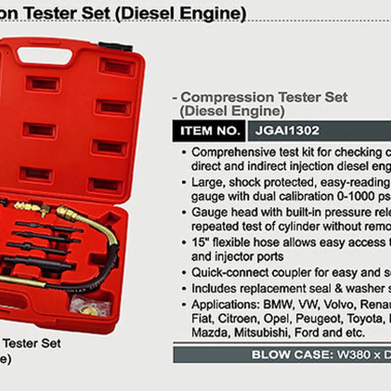 Компрессометр для дизельных двигателей профессиональный TOPTUL JGAI1302 применяется для измерения компрессии дизельных двигателей как с непосредственным впрыском, так и с раздельной камерой сгорания.Комплектующие набора изготовлены из высококачественных инструментальных материалов, что обеспечит надежность и долговечность в ходе эксплуатации. В наборе большой выбор адаптеров. Особенности:Дизельный компрессометр предназначен для измерения давления (компрессии) в двигателях дизельных легковых и грузовых автомобилей.Компрессометр TOPTUL JGAI1302 применяется для автомобилей BMW, VW, Volvo, Renault, Mercedes-Benz, Fiat, Citroen, Opel, Peugeot, Toyota, Nissan, Isuzu, Mazda. Mitsubishi, Ford и др.Большой ассортимент адаптеров, совместимых с большинством легковых и грузовых автомобилей.Манометр в ударопрочном корпусе с двойной шкалой измерения (0-1000 psi, 0-70 bar) и клапаном сброса давления.Гибкий шланг позволяет подключаться к разъемам, расположенным в труднодоступных местах.Компрессометр упакован в ударопрочный кейс размером 380х310х48 мм. Комплектация:Манометр в ударостійкому корпусі з вбудованим клапаном скидання тискуШланг високого тиску з клапаном (15") Адаптери під свічку напруження Адаптери під форсунки Шайби/ущільнення Пластиковий кейс.