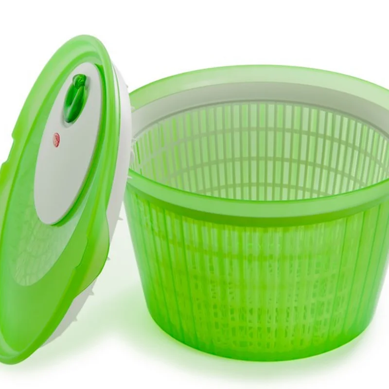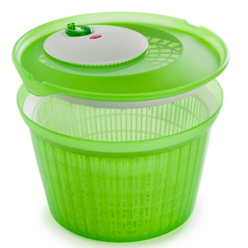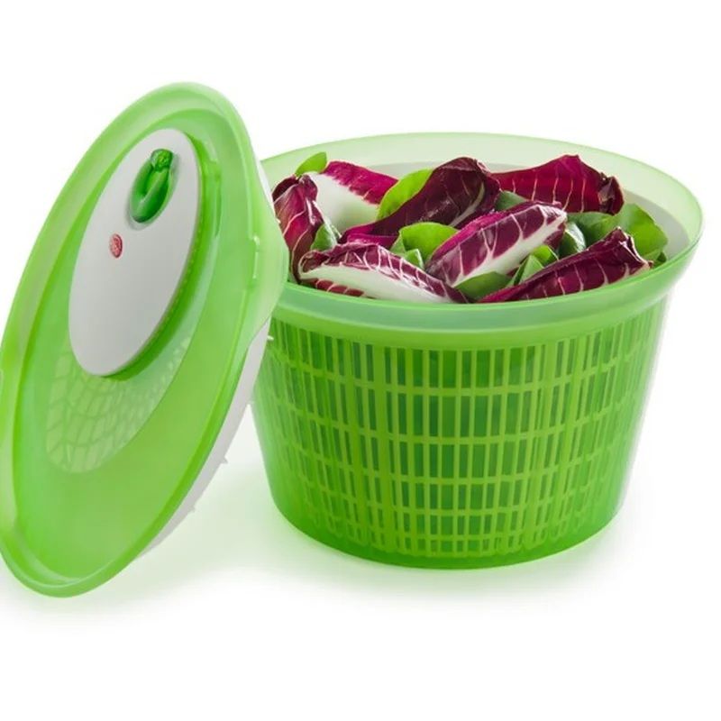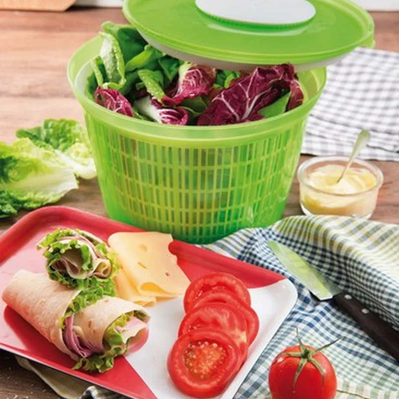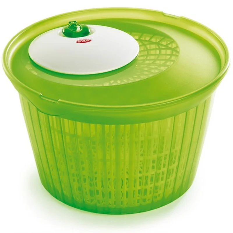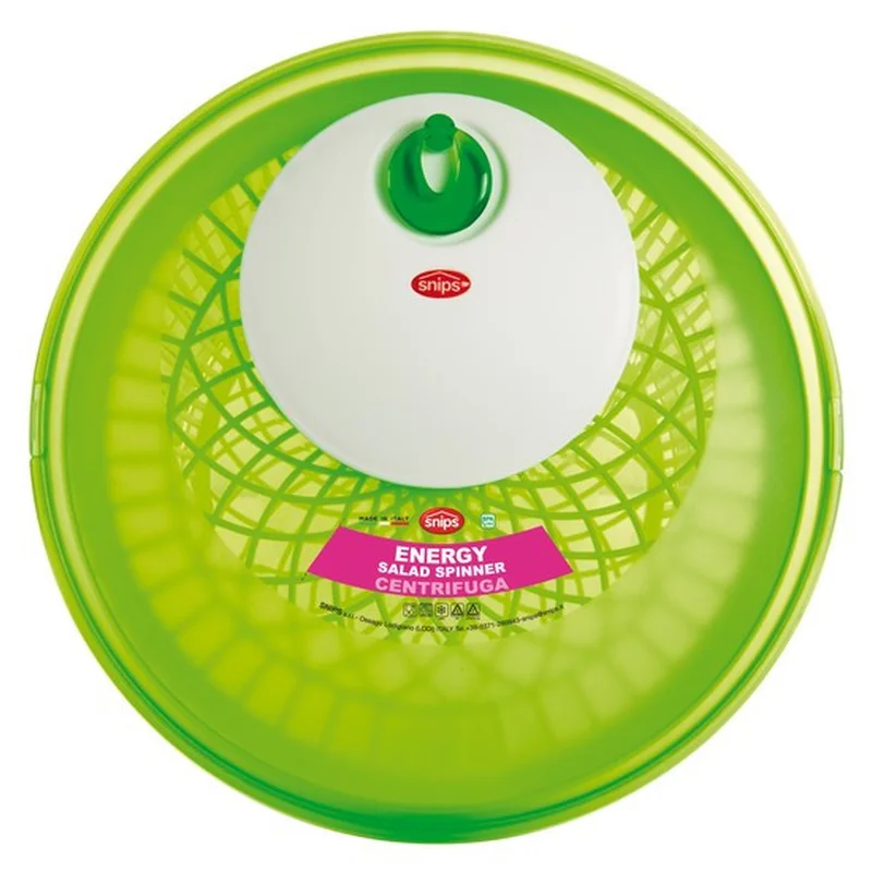 Контейнер для миття, сушки та зберігання салату. Сушарка для салату Snips за допомогою технології обертання, допоможе злити зайву воду з вимитих листків салату, свіжого шпинату, руколи і т.д. Просто помістіть овочі всередину, закрийте кришку і поверніть рукоятку, яка знаходиться на верхній частині кришки контейнера. Центрифугована вода буде опускатися на дно контейнера. Внутрішню сітчасту вставку контейнера можна використовувати як друшлак. Ручка на кришці контейнера складається для більшої компактності, кришка має застібки для більшої щільності.