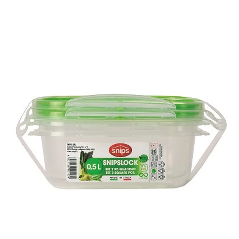 Представлений тут комплект з двох контейнерів ємністю 0.5 літра кожен від Snips, виготовлений з прозорого харчового пластику. Контейнери мають розмір 14.7 x 14.7 x 7 см ідеально підійдуть для зберігання продуктів, з можливістю миття в посудомийній машині та розігріву їжі в мікрохвильовій печі (400 Вт, до 3 хвилин). Вони не є одноразовими контейнерами. Після миття, навіть в посудомийній машині, ви можете використовувати їх.