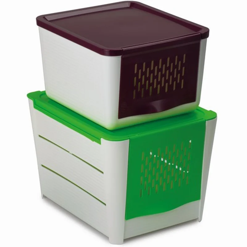 Контейнер з красивим дизайном для зберігання овочів. Контейнер темний і добре пропускає повітря для збереження свіжості овочів. У нього поміщається до 2 кг цибулі чи інших овочів. Компактний розмір дозволяє розмістити контейнер в кухонній шафі або прямо на стільниці.