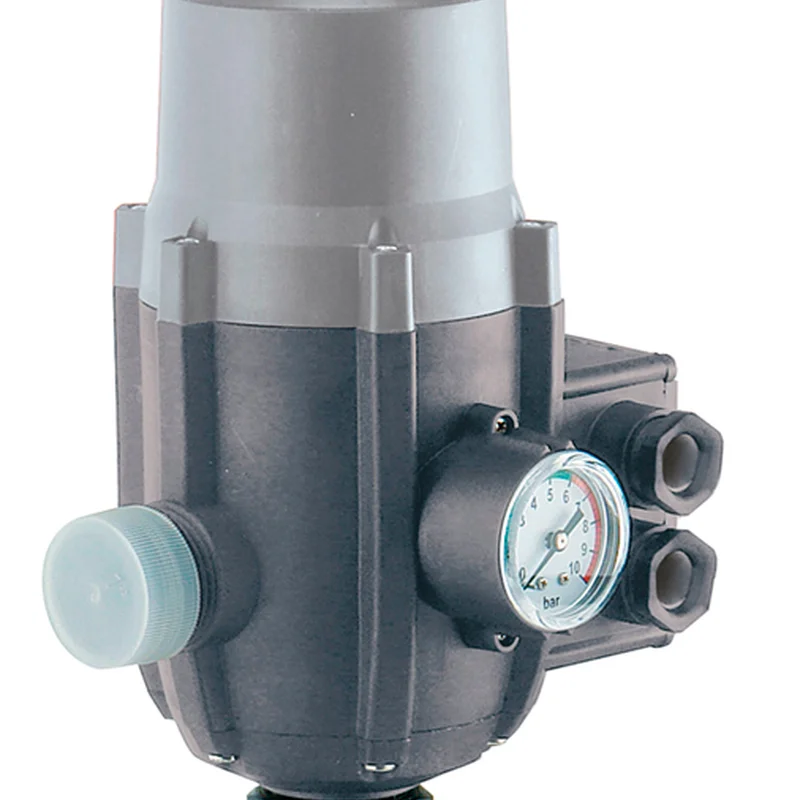 Электронные контроллеры совмещают в себе функцию реле давления (включают насос по установленному значению давления в системе), реле протока (выключают насос при отсутствии протока в системе), с защитой от "сухого хода" ( выключают насос при отсутствии перекачиваемой жидкости в системе). Некоторые модели имеют функцию автоматического перезапуска после срабатывания защиты по "сухому ходу" и возможность ручной регулировки давления включения. В некоторые модели электронных контроллеров дополнительно встроен манометр.