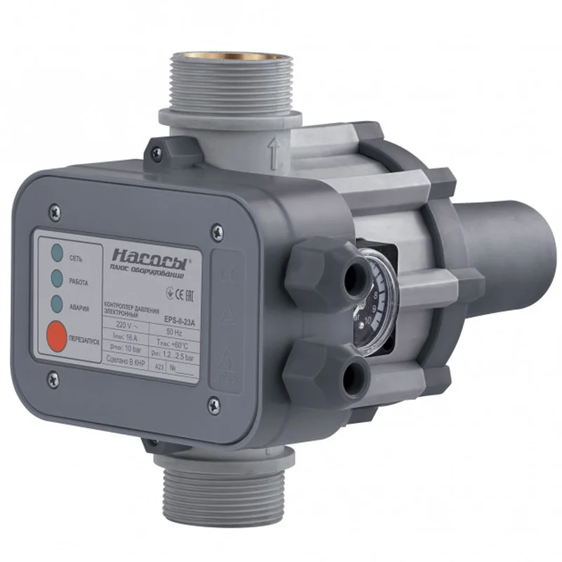 Электронный контроллер совмещает в себе функции реле давления (включает насос по установленному значению давления в системе), реле протока (выключает насос при отсутствии протока в системе), защиты от «сухого хода» (выключает насос при отсутствии перекачиваемой жидкости в системе). Имеет функцию автоматического перезапуска после срабатывания защиты по «сухому ходу», встроенный манометр и возможность ручной регулировки давления включения.