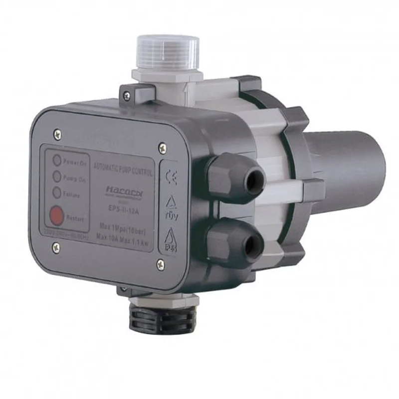 Электронные контроллеры совмещают в себе функцию реле давления (включают насос по установленному значению давления в системе), реле протока (выключают насос при отсутствии протока в системе), с защитой от "сухого хода" ( выключают насос при отсутствии перекачиваемой жидкости в системе). Некоторые модели имеют функцию автоматического перезапуска после срабатывания защиты по "сухому ходу" и возможность ручной регулировки давления включения. В некоторые модели электронных контроллеров дополнительно встроен манометр.