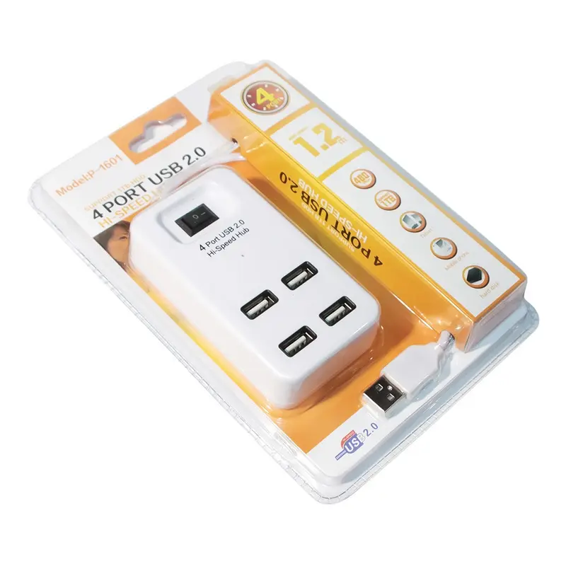 Кількість роз`ємів (портів) USB2.0: 4шт Швидкість портів: до 480 Mбіт/с Живлення від USB порта Вимикач живлення хаба Тип матеріалу: пластик Колір: білий