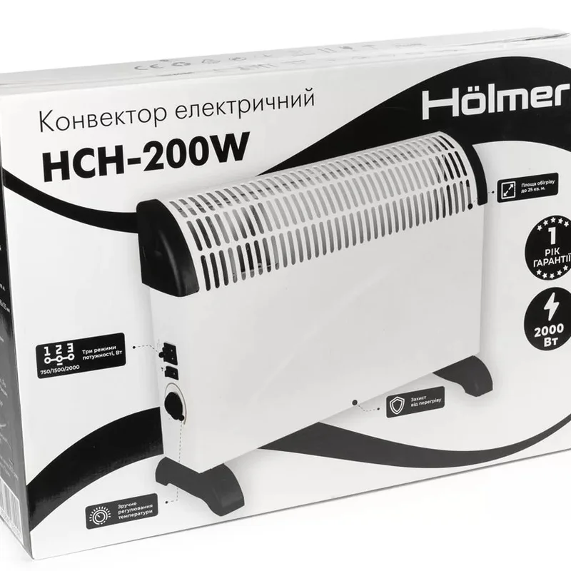 Електричний конвектор Holmer HCH-200W – сучасний опалювальний прилад і незамінний помічник по обігріву приміщення до 25 кв.м. Зручна та функціональна модель призначена для установки на підлогу (в комплекті ніжки 2 шт), проста в управлінні та експлуатації. Конвектор з механічним управлінням, потужністю 2000 Вт, функцією захисту від перегріву та класом електрозахисту IP20. Лаконічний дизайн Виріб виконаний в сучасному дизайні, має прямокутну форму із закругленою верхньою частиною, яка виключає ризик випадкового травмування. Модель HCH-200W представлена в класичному білому кольорі, зі стильними чорними бічними вставками й опорами для установки на підлогу. Такий опалювальний прилад ідеально впишеться у будь-який інтер’єр. Потужність і безпека Holmer HCH-200W працює від стандартної електричної мережі на 220 – 240В. Максимальна потужність моделі складає 2000 Вт. Можна також встановити потужність від 750 Вт до 2000 Вт. Є функція прискореного прогрівання приміщення за допомогою вбудованого вентилятора. Має клас електрозахисту IP20 та функцію захисту від перегріву, яка забезпечує безпеку користування та продовжує термін служби пристрою. Для регулювання температури опалювального приміщення конвектор оснащений механічним терморегулятором. Просте управління На бічній панелі обігрівача розташована механічна панель управління: кілька перемикачів, що призводять пристрій в робочий режим і механічний термостат для регулювання температури. Площа обігріву до 25 кв.м Конвектор працює безшумно, не сушить повітря й не спалює кисень, швидко виконує роботу по обігріву приміщення, створюючи атмосферу тепла та затишку у вашій оселі. Міцний металевий корпус виробу покритий термостійкою фарбою. Дана модель є надійним та безпечним пристроєм, який можна використовувати для обігріву будь-якого типу приміщень площею до 25 кв.м. Компактність і експлуатація Holmer HCH-200W простий і зручний в експлуатації. Встановлюється на підлогу за допомогою ніжок, що входять в комплектацію. Покриття для опори забезпечують надійне розташування приладу, запобігаючи випадковому перекиданню. Завдяки компактним габаритам і невеликій вазі, обігрівач легко переміщати в приміщенні, а також, не потрібно багато місця для його установки та зберігання.
